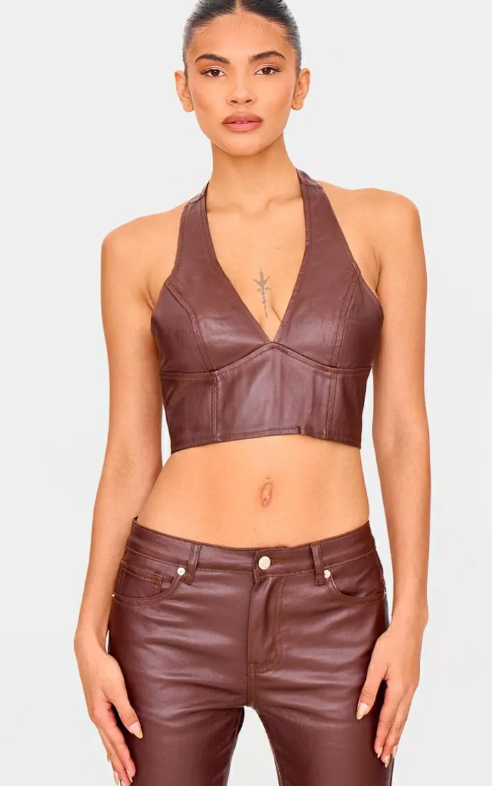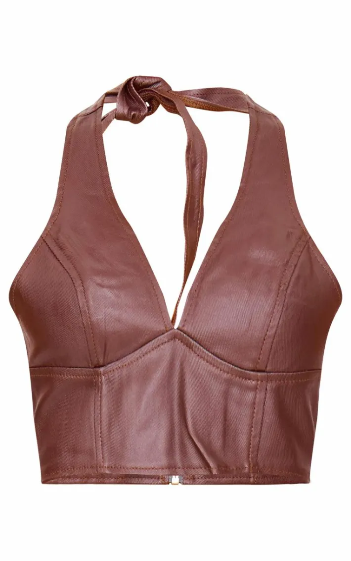 Look all kinds of chic in this brown coated denim seam detail halterneck top. Brought to you in a brown hue denim material with a coated design and seam detail, this halterneck top is a must have for any occasion. Style with the matching flare pants, slip on heels and gold accessories for an edgy look we can’t take our eyes off.