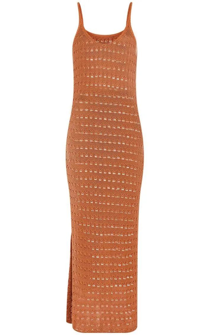Make a statement this season with this brown crochet knitted side split maxi dress. This unreal dress is brought to you in a brown knitted material with a crochet design that will have you feeling totally on trend this season. With a side split detail and a maxi length, hearts will be racing. Team with some clear heels and your fave gold accessories to amp up your look even further.