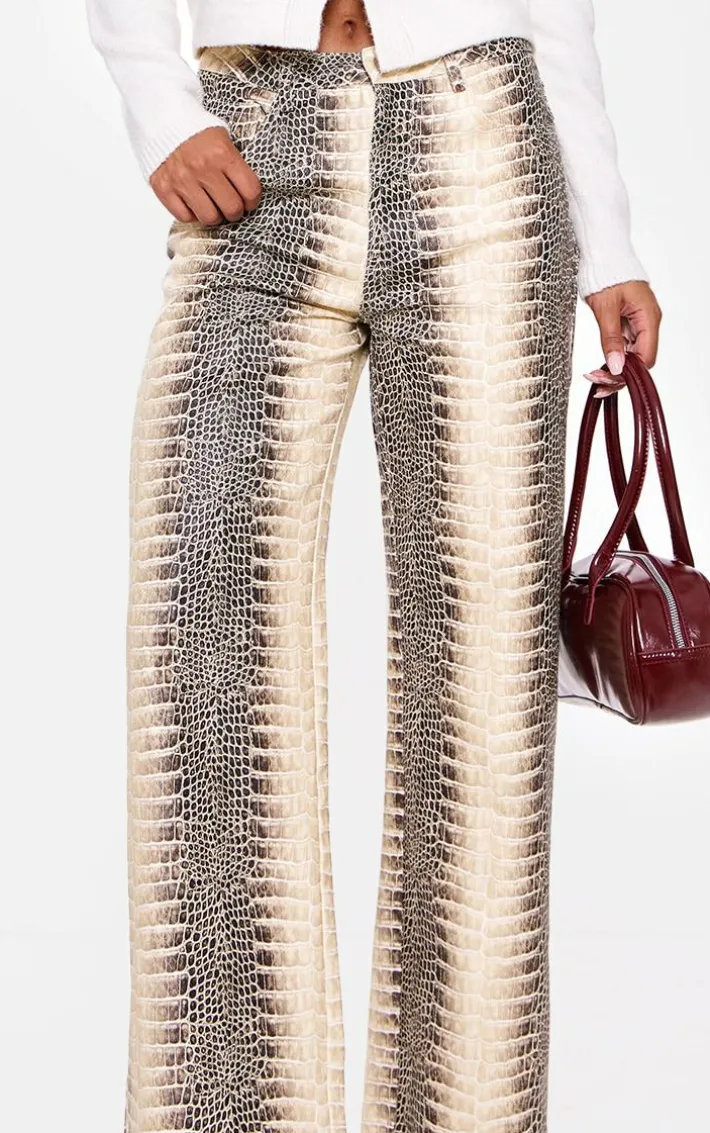 Make a statement this weekend in these brown denim low waist snake print wide leg jeans. Brought to you in a brown hue denim material with a snake print design and low waist detail, these wide leg jeans are at the top of our wish list. Style with a white cardigan and burgundy accessories for a seasonal look we can’t get enough of.