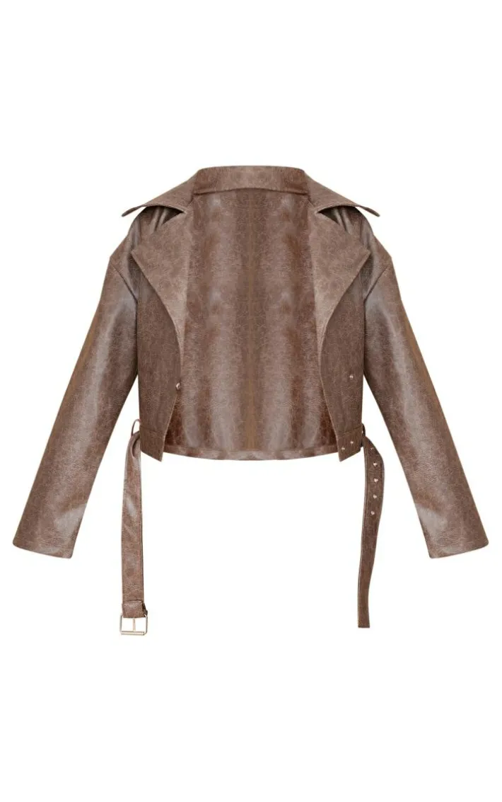 Give your new season wardrobe the ultimate chic upgrade it deserves with this brown distressed faux leather relaxed fit belted biker jacket, it is sure to be a staple piece in your new season wardrobe. This jacket features a brown distressed faux leather material with a belted design and a relaxed fit, how could you not be obsessed? Pair with a basic top, fitted shorts and flat mules for a combo we’re crushing on.