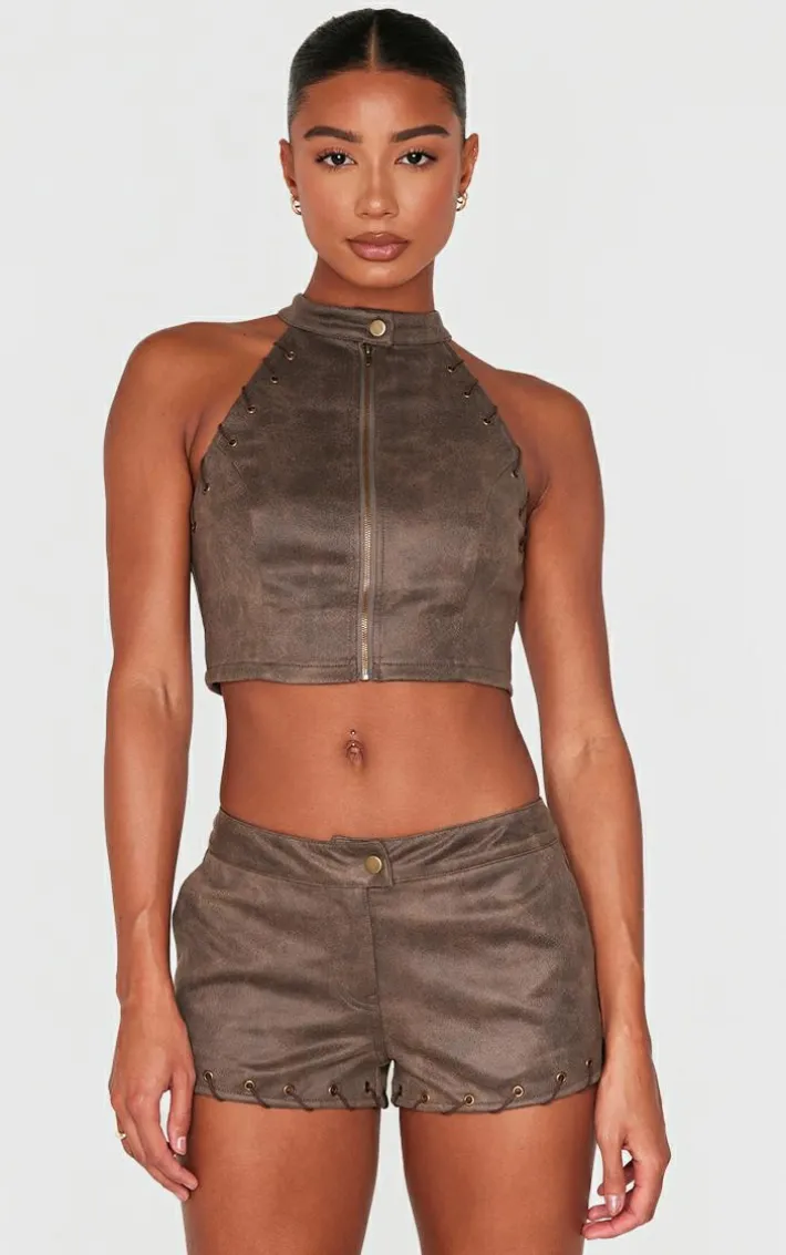 We’re bringing the weekend worthy fits to you with these brown distressed faux suede eyelet hotpants. With a brown distressed hue, soft faux suede fabric and eyelet detailing, you’ll be channelling all the confidence. For a fierce faux suede two piece set look, pair these hotpants with the matching zip up top, knee high boots and a faux leather handbag.
