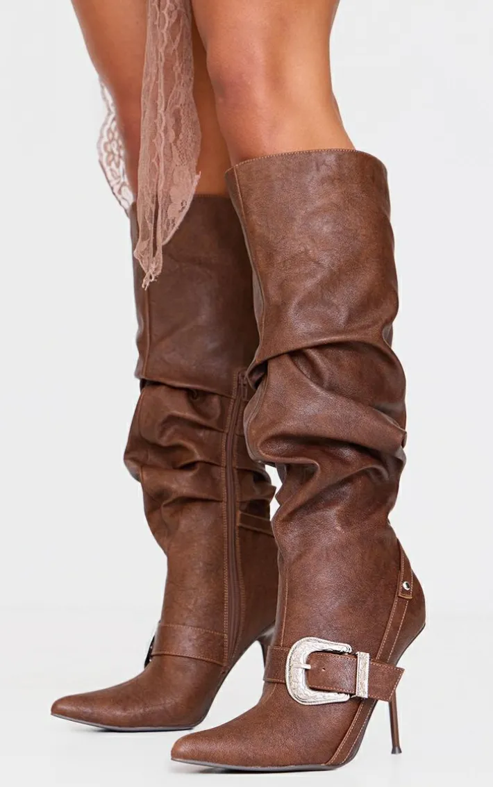 You can never have too many seasonal bots, that’s why we’re bringing you these brown distressed PU point toe buckle knee high stiletto heeled boots. With their edgy brown shade, distressed Pu material and luxe buckle design, these are sure to have you feeling chic. Team with silver accessories and a mini skirt for a statement look like no other.