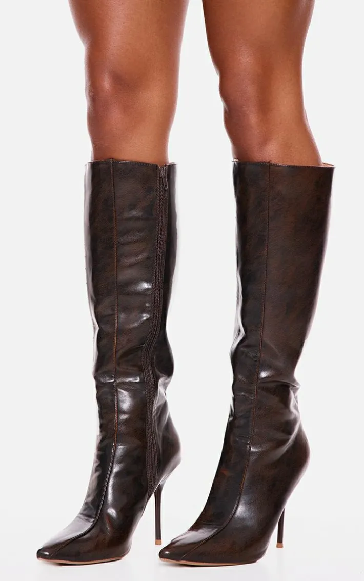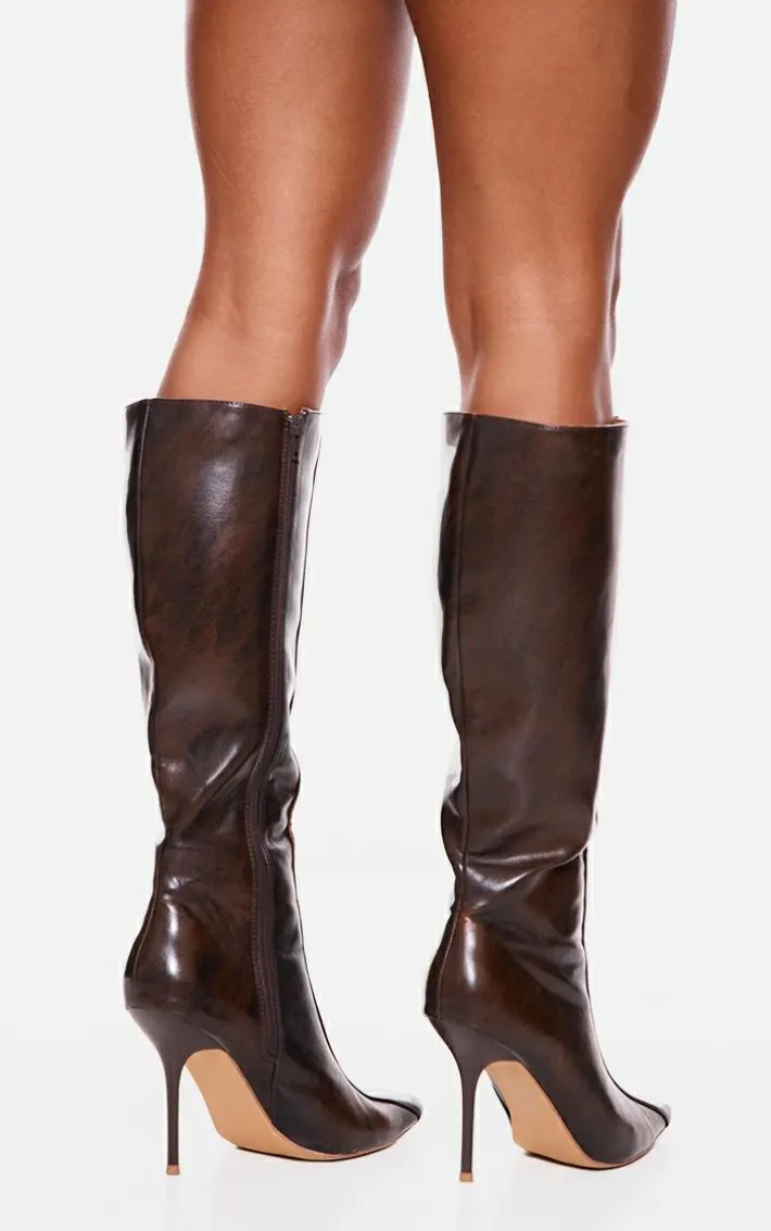 Level up any look with these brown distress PU point toe knee high heeled boots. Brought to you in a brown PU material with a distressed design and a point toe detail, what more could you want? These knee high heeled boots are perfect for those day to night look and beyond. Pair with your go-to look for a fool proof finish.