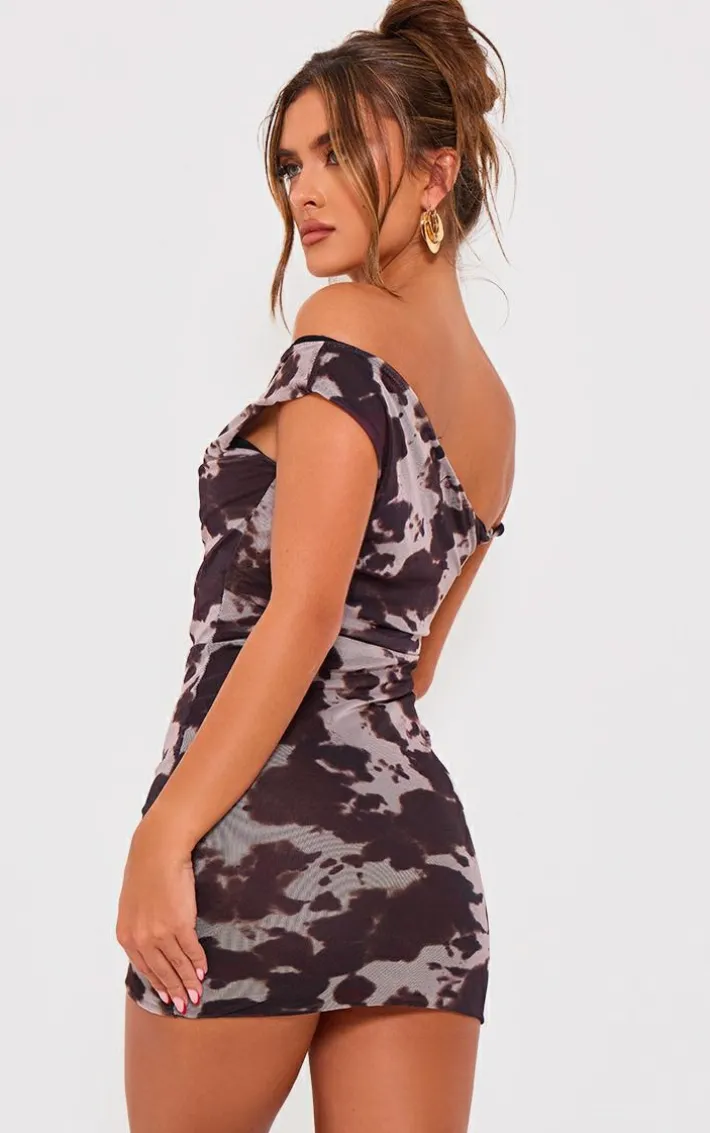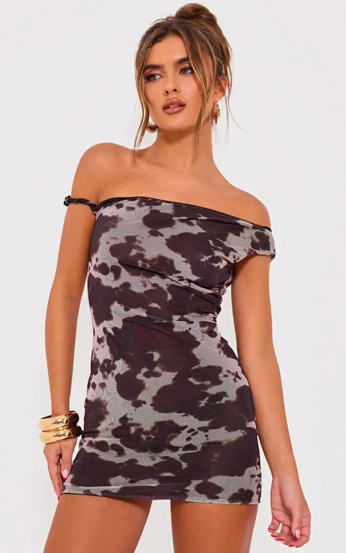 Your next party look is sorted with this brown double layer slinky cow print twist bodycon dress. Brought to you in a new season cow print, a double layer slinky fabric and twisted, off the shoulder neckline, how can you say no? Steal all the stares when styled with knee high boots and chunky gold jewelry.