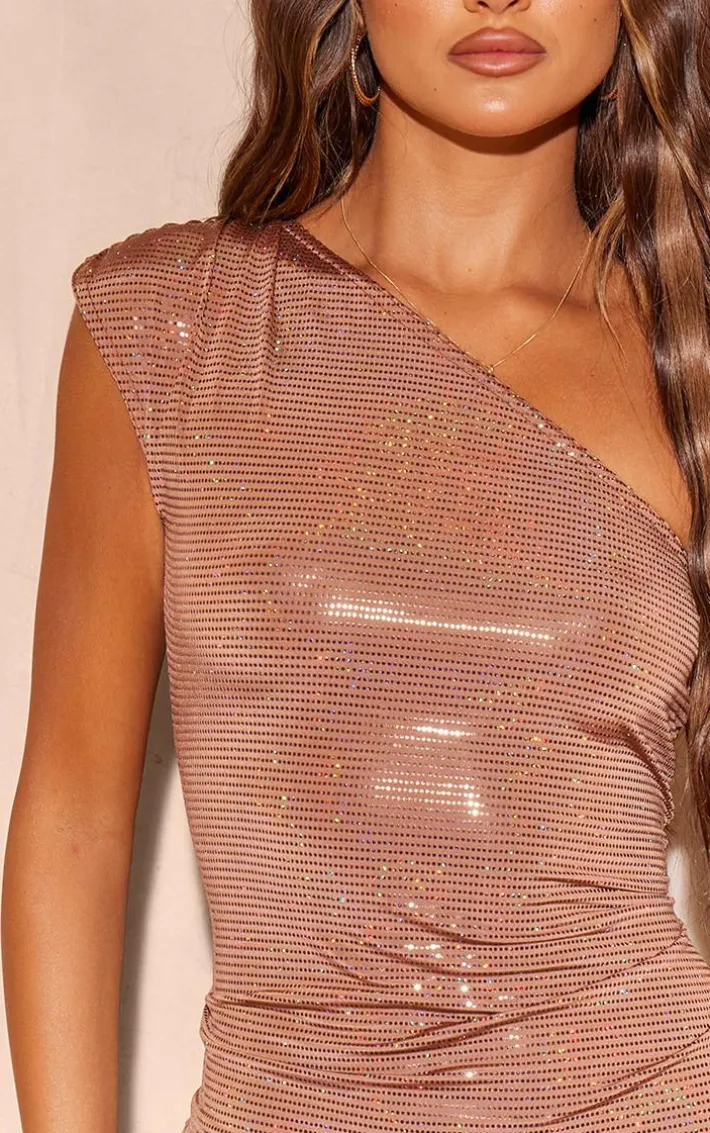 Turn heads this season with this brown glitter one shoulder mini dress. Brought to you in a brown glitter material with a one shoulder design and mini length, what’s not to love? Finish off the look with statement heels, gold accessories and a mini bag for a weekend worthy look.