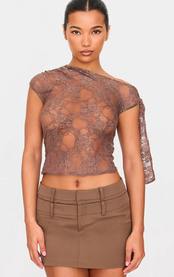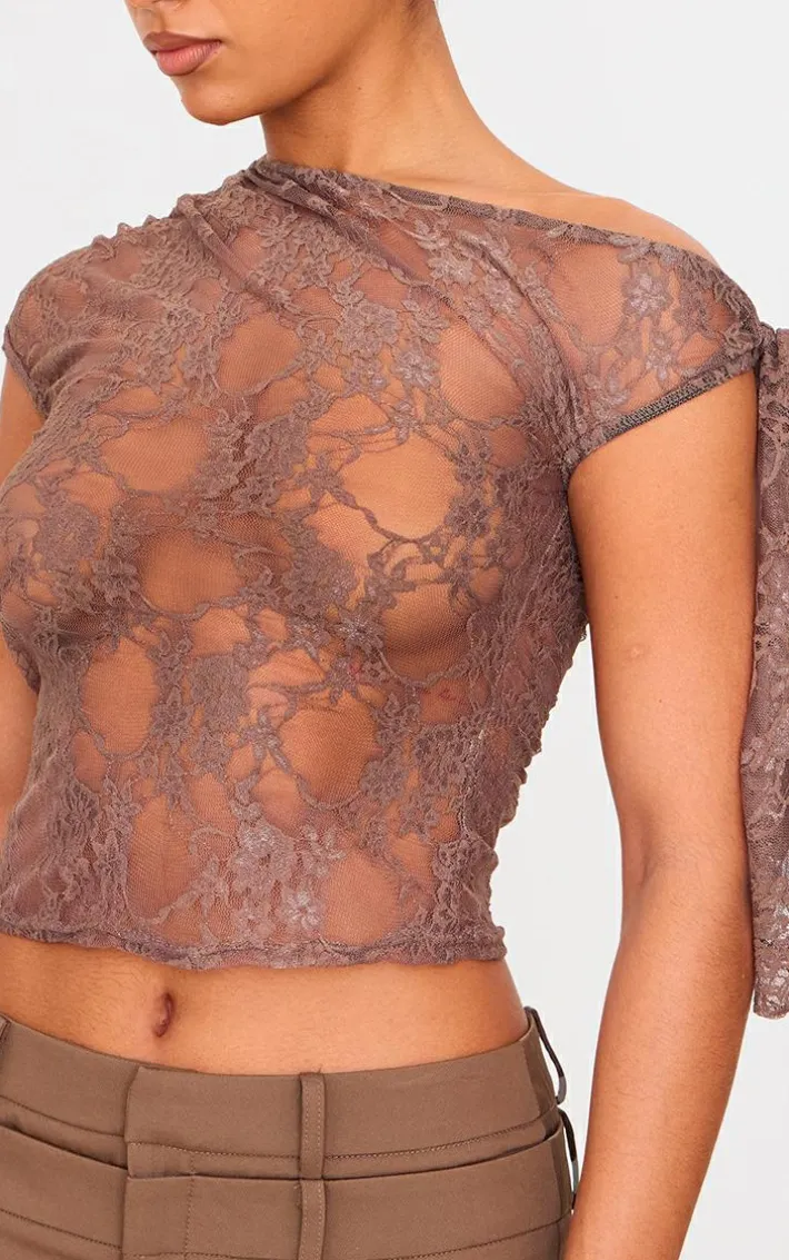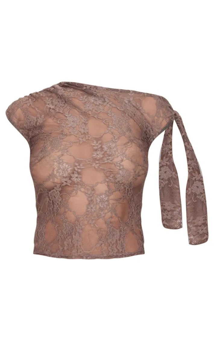 Bring all the luxe lace feels to your weekend look with this brown lace detail tie shoulder asymmetric long top. Made from a brown lace material with it shoulder detailing and an asymmetric design, what more could you want? Style this long top with a mini skirt and heels for a look that will have all eyes on you.