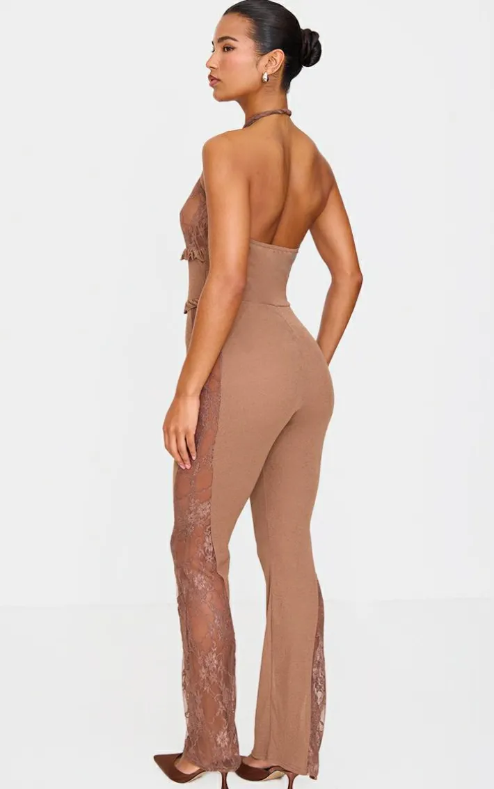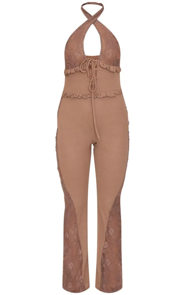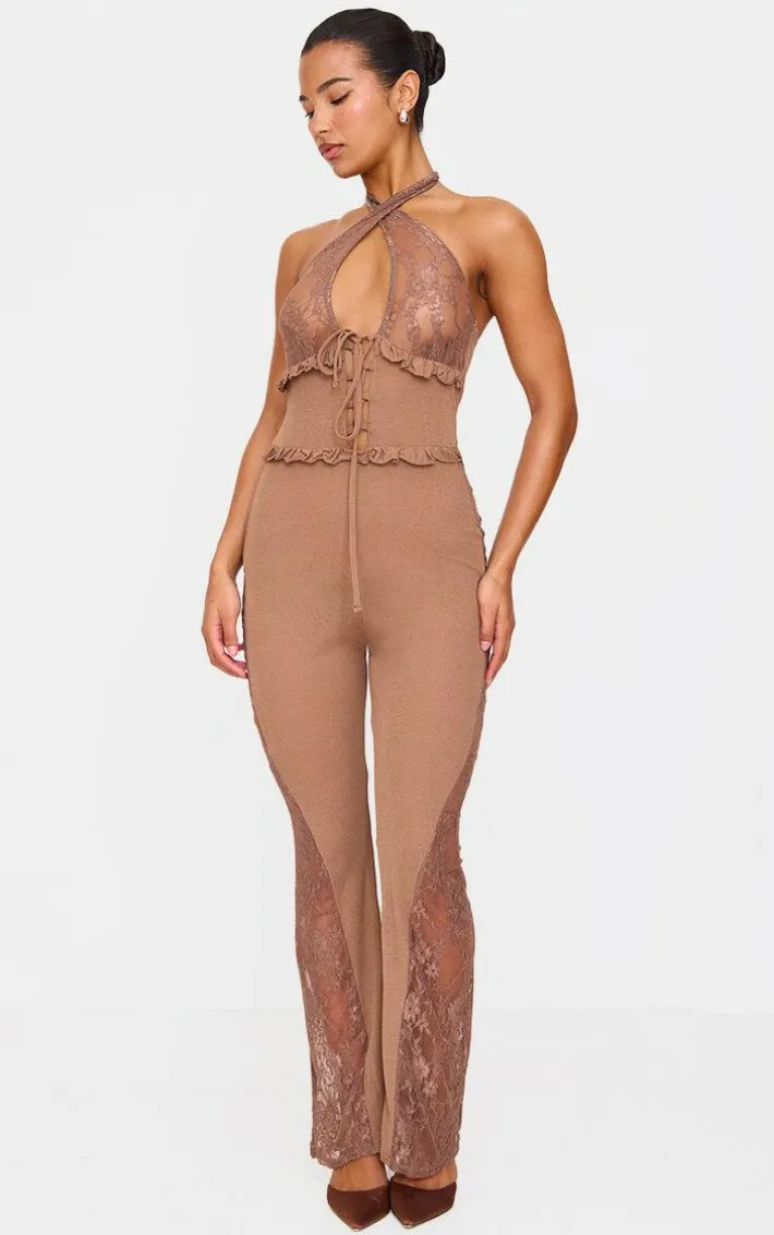 Looking for a new jumpsuit to add to your wardrobe? Then you need this brown lace trim mesh halter neck sheer jumpsuit in your collection. Brought to you in a brown sheer mesh material with a lace detail and a halter neck design, what’s not to love? This jumpsuit pairs perfectly with court heels and gold accessories. It’s a yes from us.