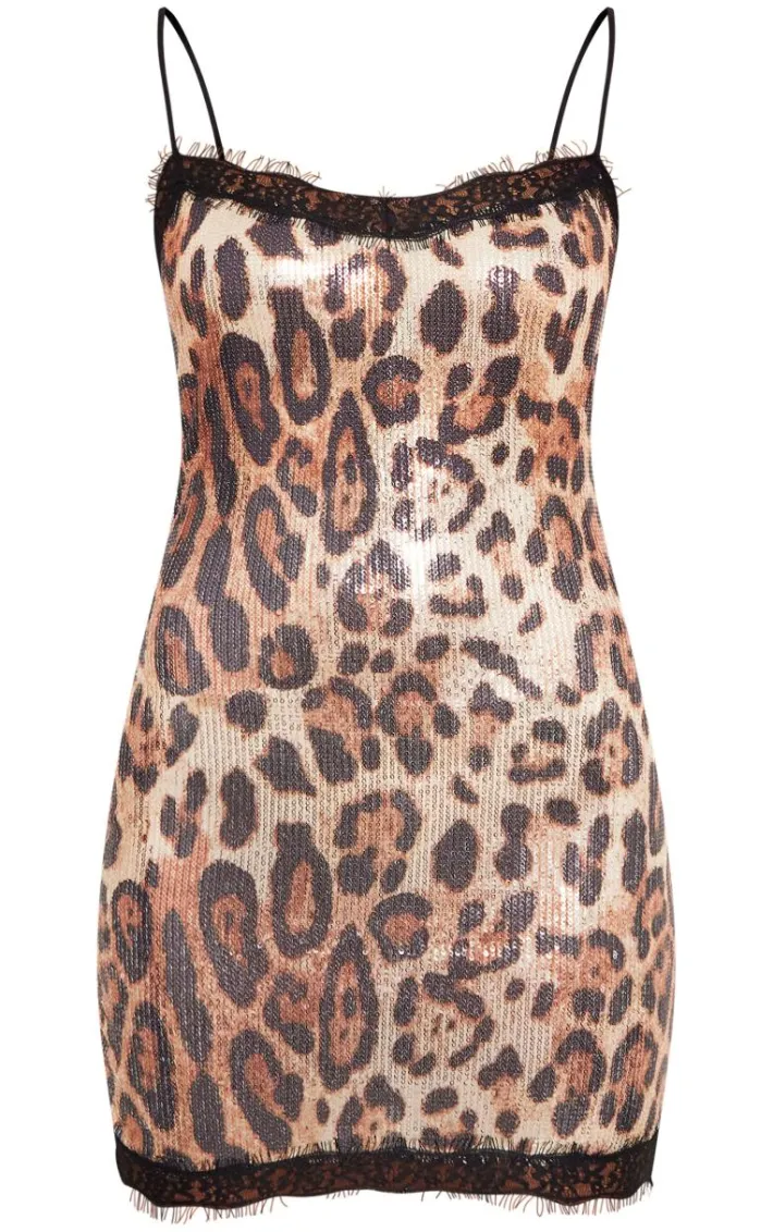 Make sure your weekend look stays on trend in this brown leopard print sequin lace trim mini dress. Brought to you in a brown hue sequin material with a leopard print design and lace trim detailing for that extra touch of luxe, how can you go wrong? Style this mini dress with your highest heels and gold accessories for a look that is sure to have all eyes on you.