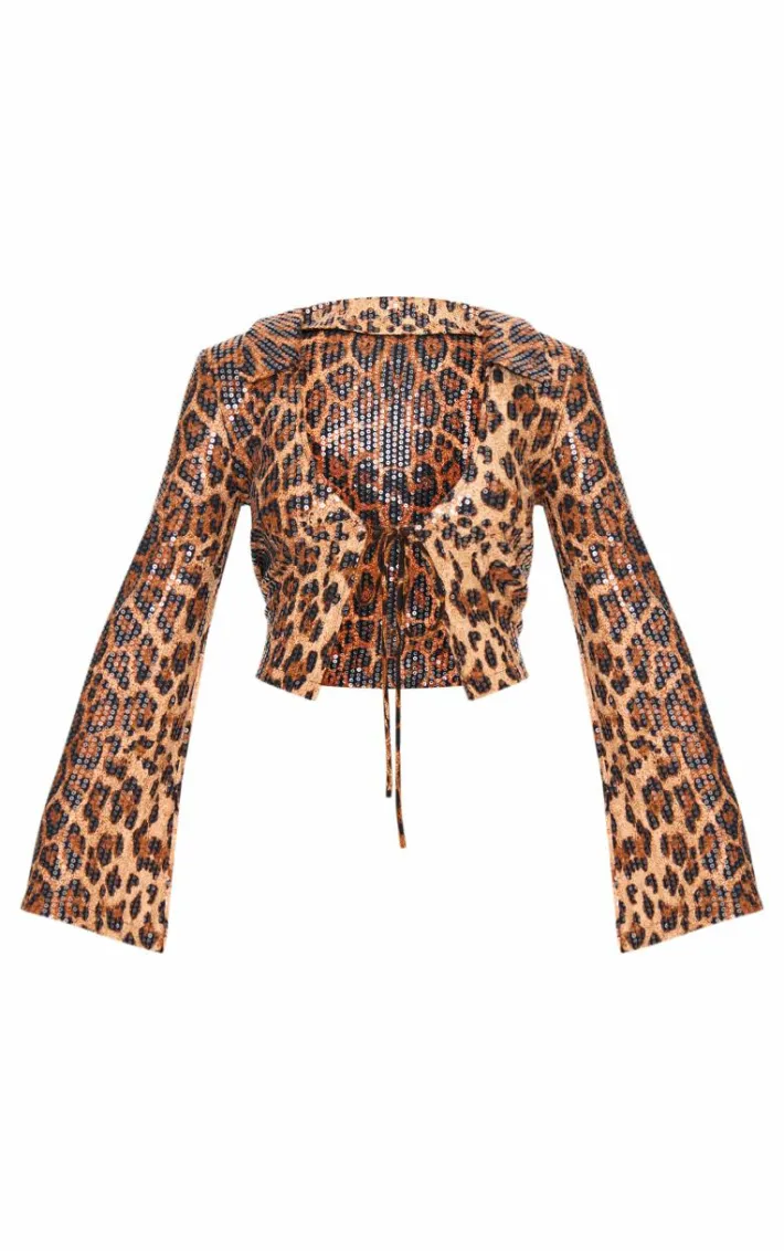 Make a statement in this brown leopard print sequin tie front detail long sleeve shirt. Brought to you in a brown sequin material with a leopard print design, tie front detail and long sleeves, how can you resist? We are loving this brown shirt styled with the matching skirt, heels and gold accessories for a look that will turn heads.