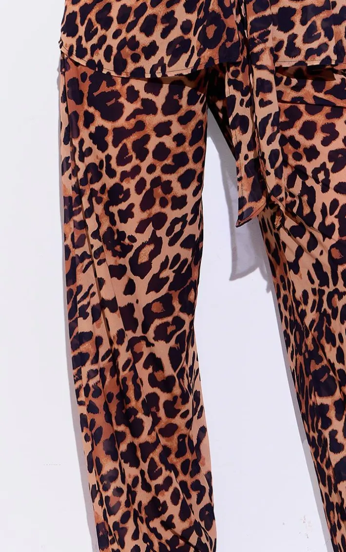 Channel new season trends with these brown leopard print wide leg beach pants. Brought to you in a brown hue material with a leopard print design and a wide leg fit, we are obsessed. Pair these beach pants with the matching shirt, a bikini and statement accessories for a look that is perfect for your next vacay.