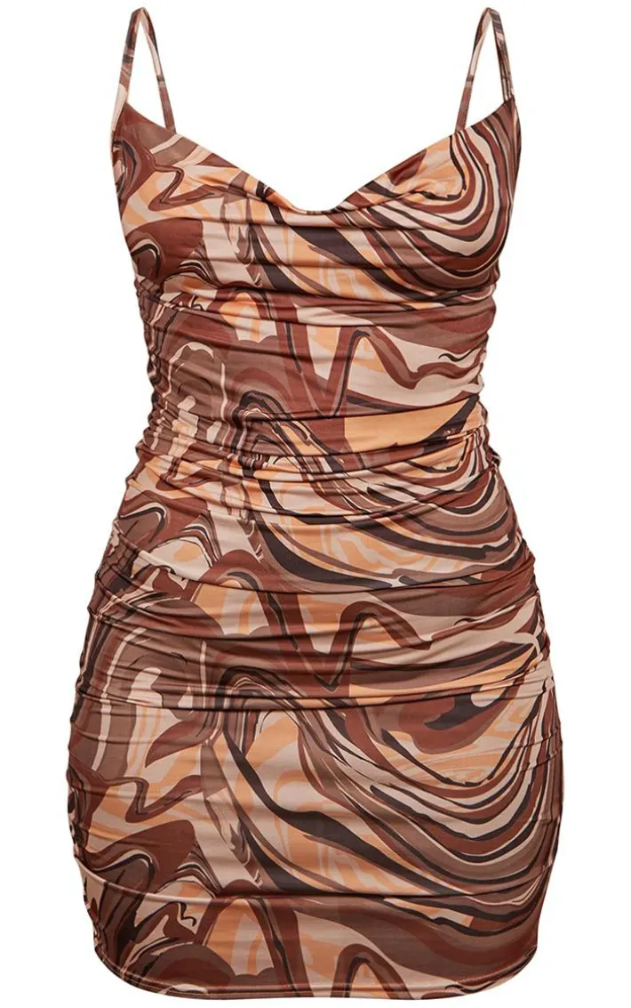 Your weekend look is finally sorted with this marble print ruched dress. Featuring a brown marble print material with thin straps, a cowl neck design, ruched detailing and a figure-hugging fit, how could you say no? A mini dress in a ruched and bodycon style is perfect for all your weekend plans and beyond. Get ready to turn heads , just team it with tie-up heels and your go-to accessories for a seriously chic combo.