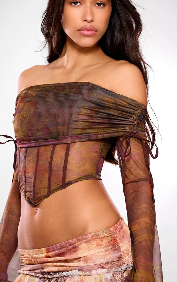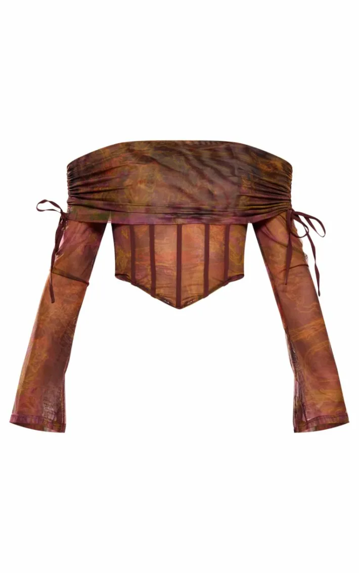 Enter the weekend in style with this brown mesh bardot boning corset. Brought to you in a brown mesh material with a bardot neckline and a flattering boned corset fit, how can you say no? Style this brown corset with a mini skirt, heels and gold accessories for a look that will make you stand out from the rest.