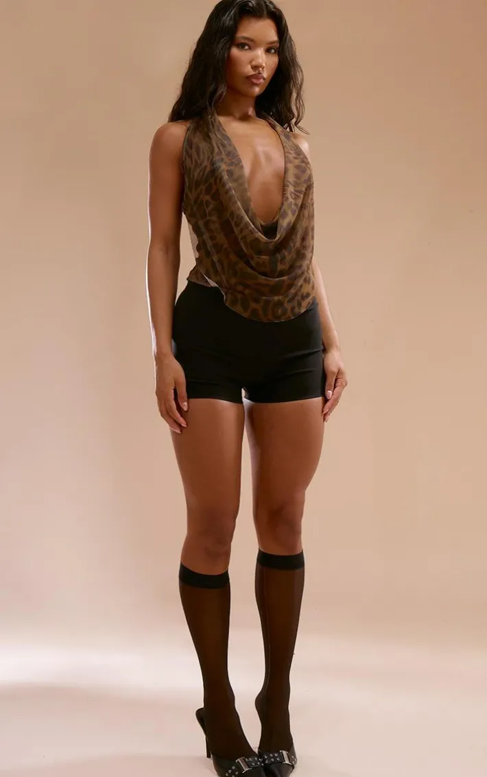 Inject some on-trend animal prints into your weekend look with this brown mesh printed halter neck top. Brought to you in a brown mesh material with a halterneck design, an leopard print and a plunging neckline, how can you resist? Style this mesh top with shorts, court heels and statement gold accessories for a look that is sure to make heads turn.