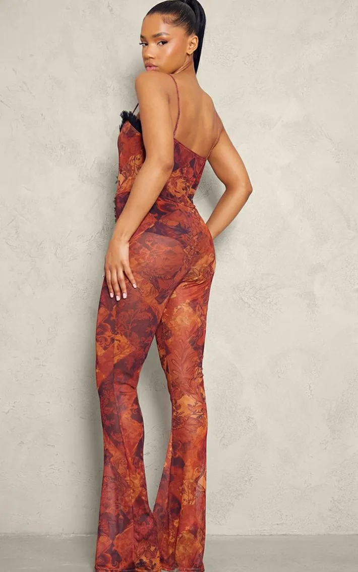 Get ready to make a serious style statement in this brown paisley print mesh cut out frill detail jumpsuit. Brought to you in a brown hue mesh material with a paisley print design and cut out detailing, how can you not be obsessed? In a figure-worshipping fit, they won’t be able to take their eyes off your in this brown jumpsuit. Just add heels and some gold accessories to elevate the look.