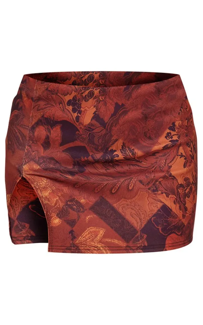 Your weekend fit is finally sorted with this brown paisley print stretch woven extreme split hem micro mini skirt, you’re sure to be earning all the compliments. This skirt features a brown paisley print stretch woven material with a split hem design and a micro mini length. Pair it with a bardot top, strappy heels and simple accessories for a look that’s perfect for your next event.