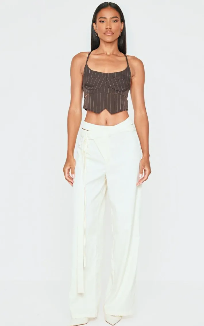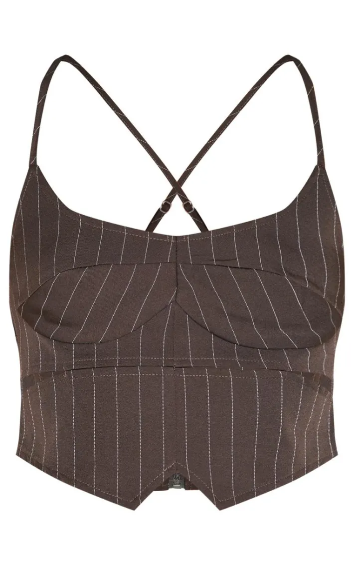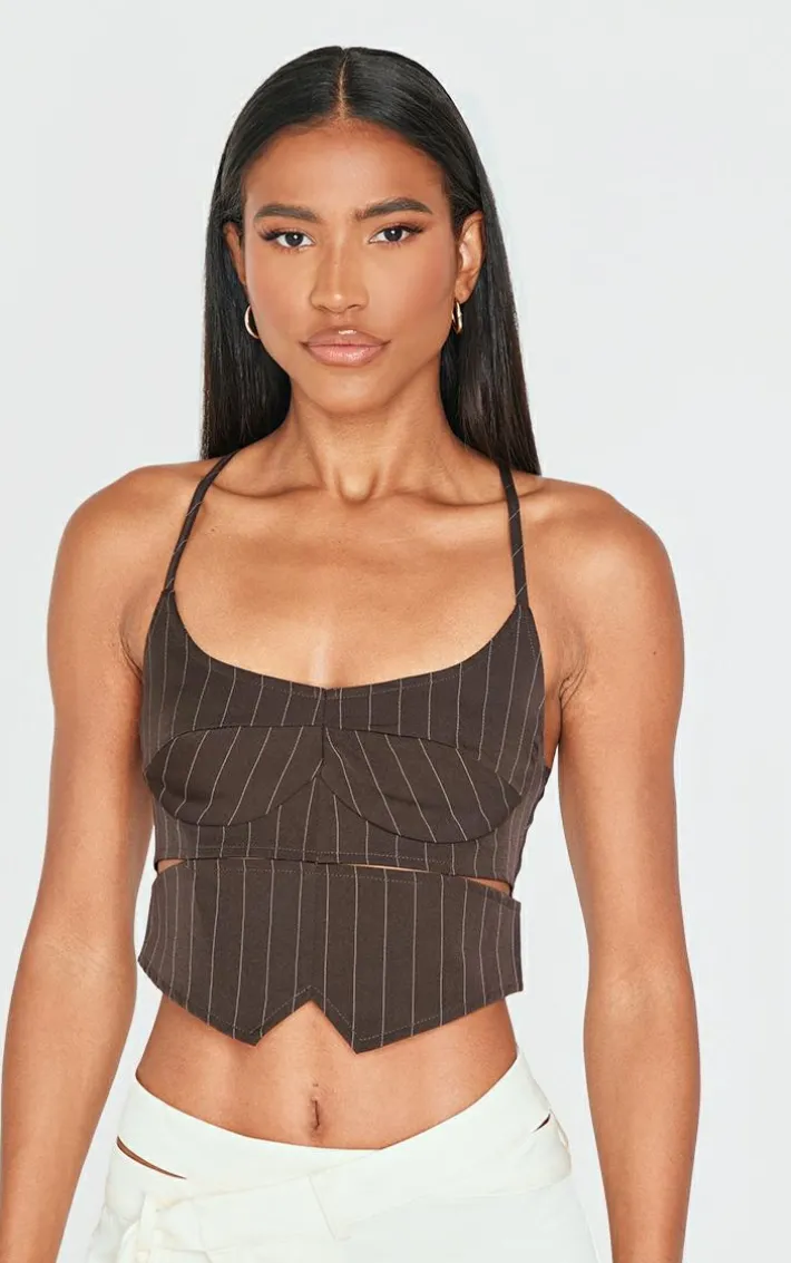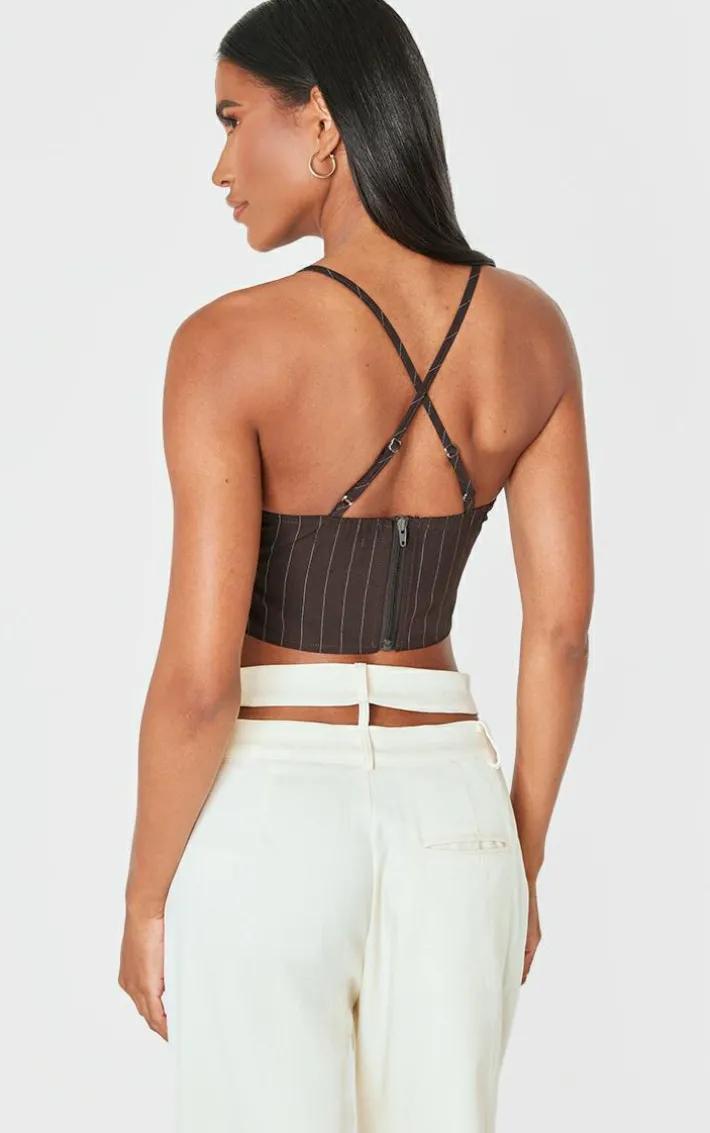 Keep it chic in this brown premium woven pinstripe cross back cropped corset. Brought to you in a brown hue woven material with a pinstripe design and cross back detailing, how can you resist? Style this cropped corset with wide leg pants and court heels for a look that is perfect for weekend styling.