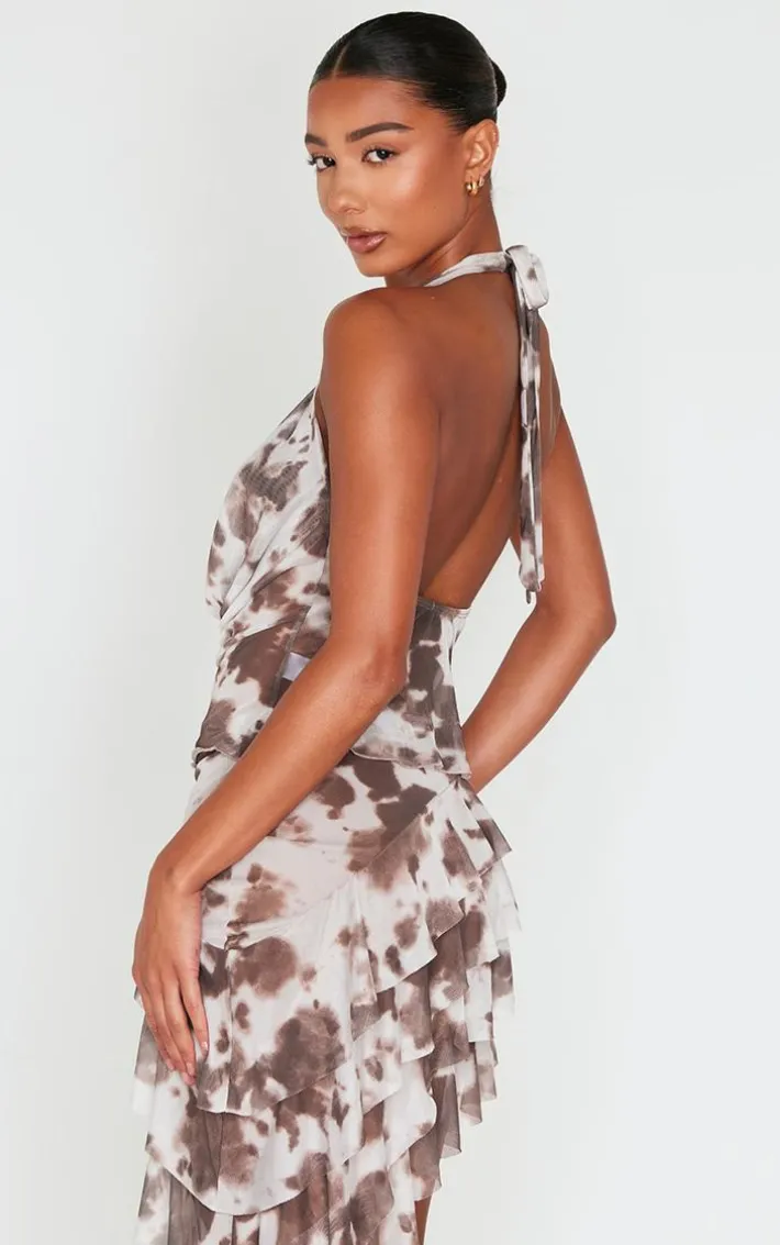 Work your styling techniques to make this brown printed mesh cowl halterneck crop top suit any occasion. Brought to you in a brown hue mesh material with a printed design and cowl neckline, this halterneck crop top is a must have. Style with the matching skirt, slip on heels and gold accessories for a chic finish.