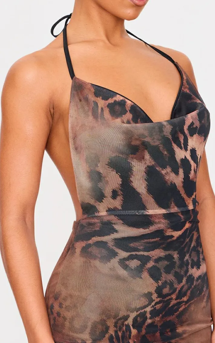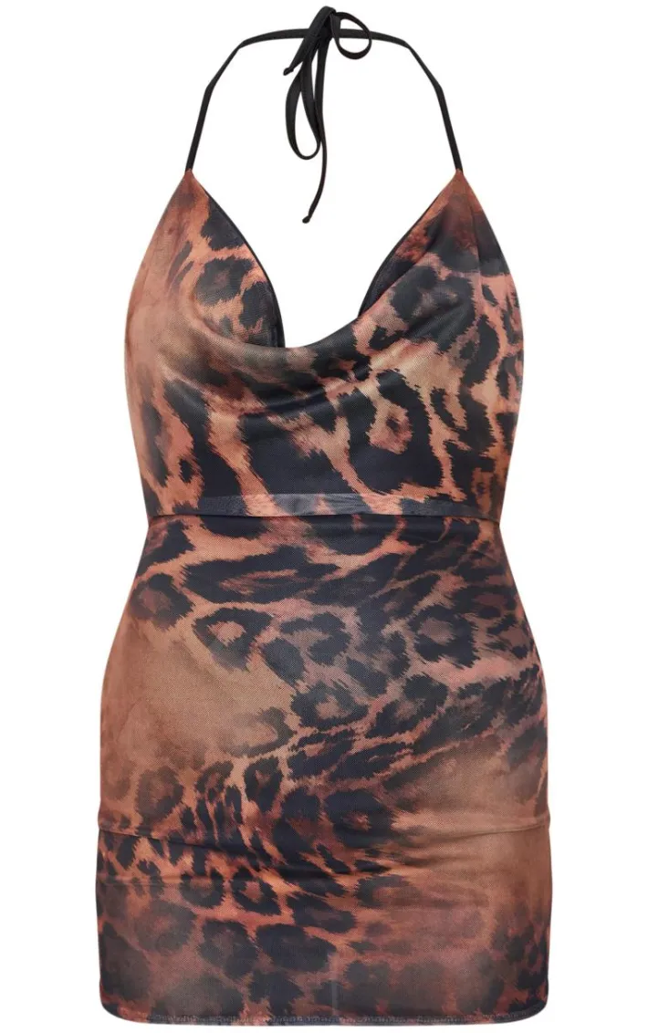 Elevate your weekend wardrobe with this brown printed slinky cowl neck mini dress. Brought to you in a brown hue slinky material with a printed design and cowl neckline, this mini dress is all the new you need. Team with slip on heels and gold accessories for a look like no other.