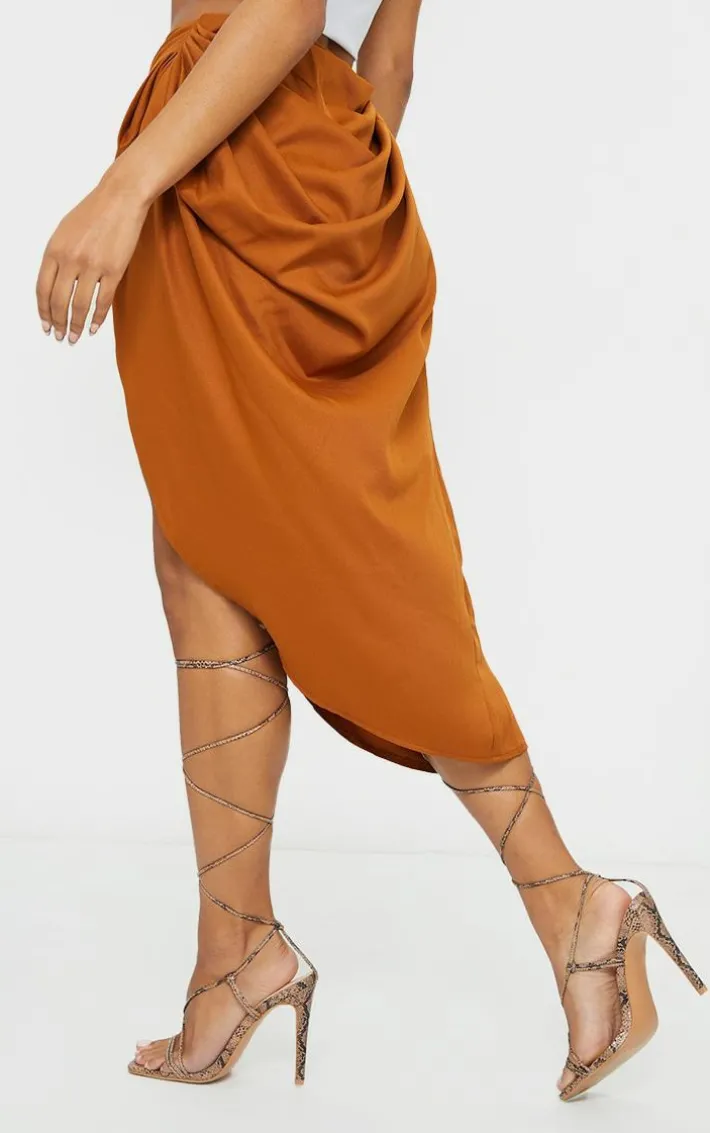 Add this midi skirt to your new-season wardrobe. Featuring a brown fabric with ruched side detailing, team this with a crop top and heels for a brunch date.