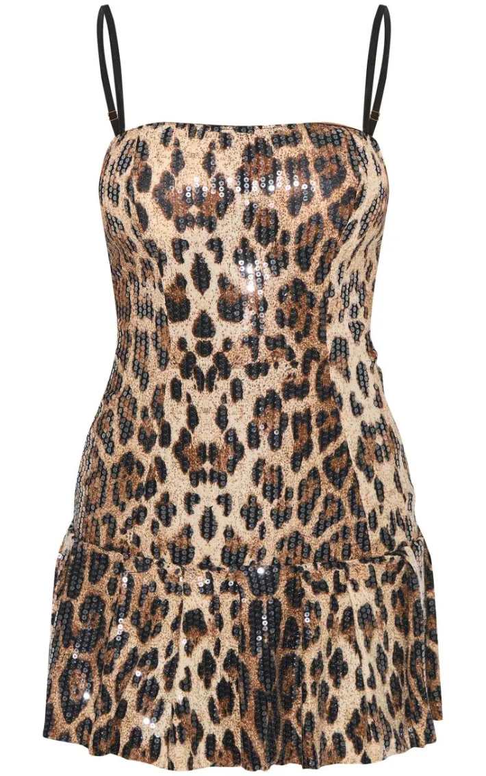 We’re all for a fierce leopard print dress, and this brown sequin leopard frill skirt mini dress is no exception. You’ll be attracting all the right attention at your next party with its brown sequin leopard print fabric, frill skirt and straight neckline. Bring the look together with slip on shoes and any must-have accessories.