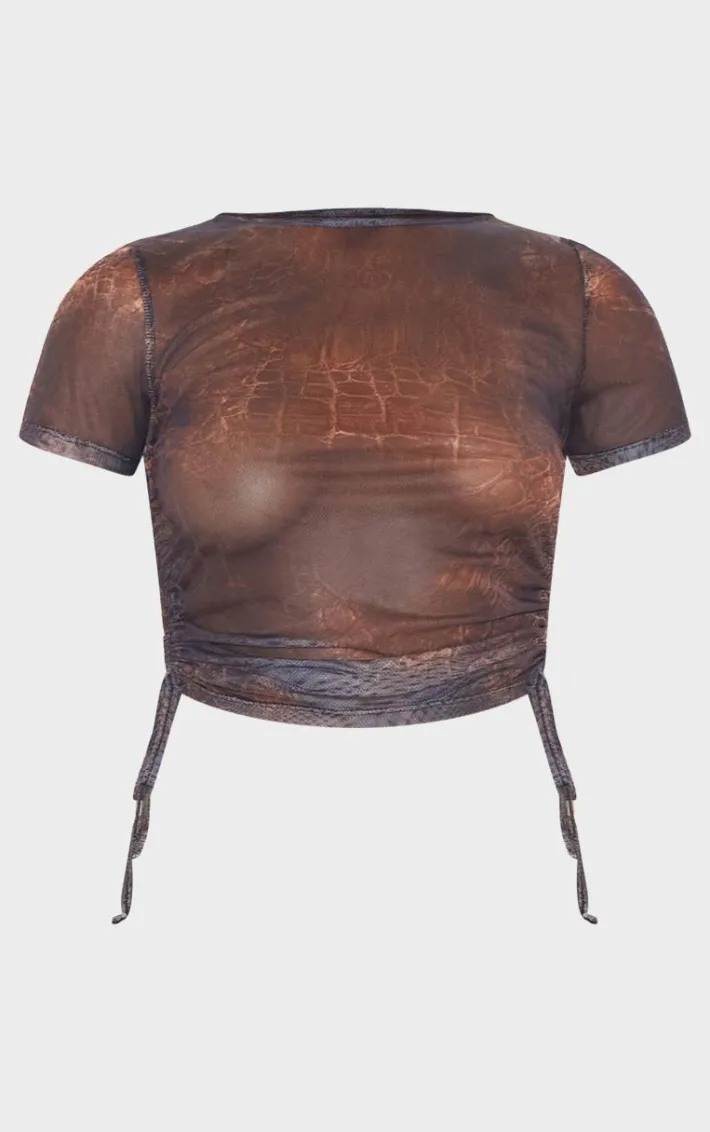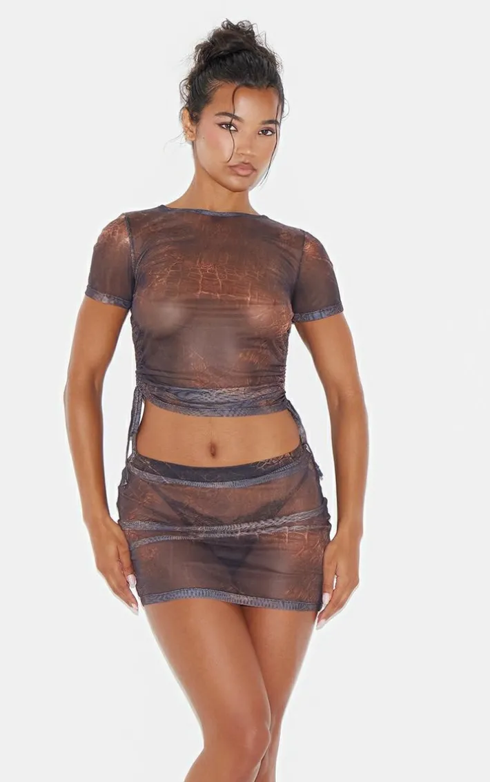 Take your weekend look to new heights with this brown snake print mesh short sleeve ruched side crop top. Brought to you in a brown hue mesh material with a snake print design, short sleeves and ruched side detailing, how can you say no? Pair this crop top with the matchig skirt, heels and gold accessories for a look that is sure to have all eyes on you.