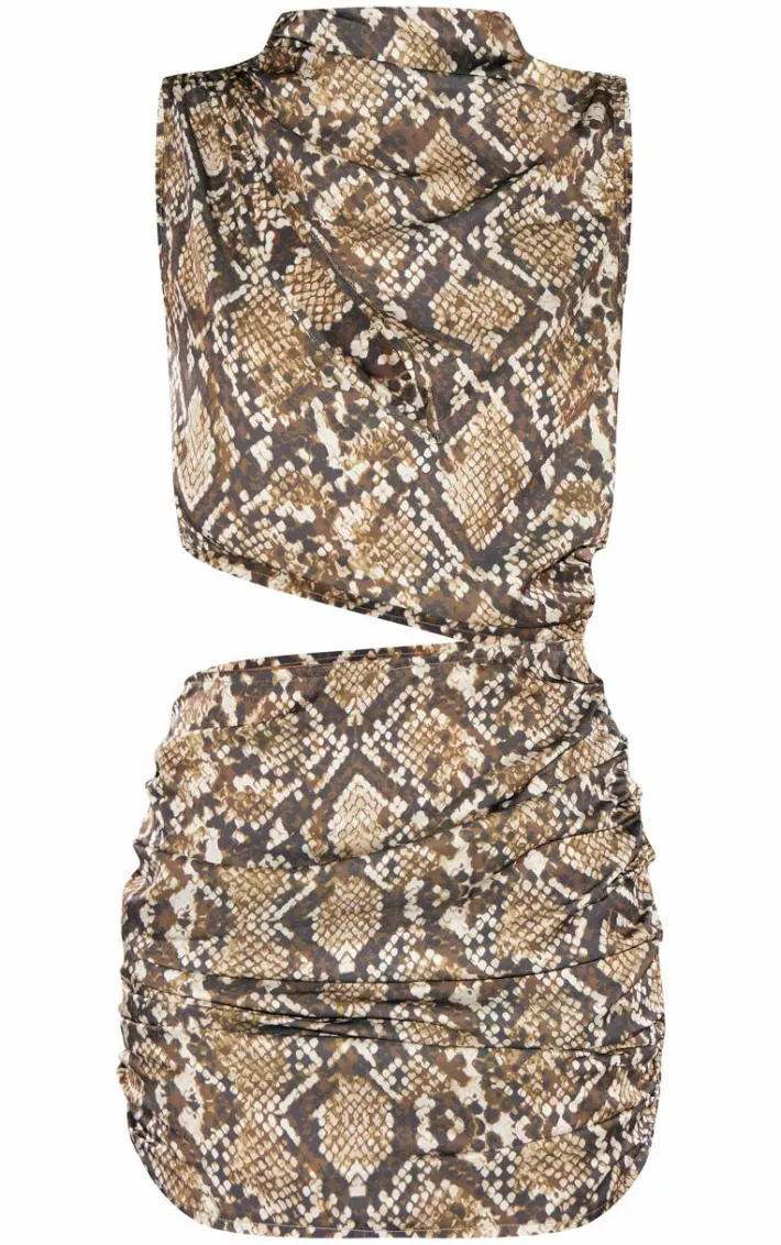 Switch up your style game with this brown snake satin high neck cut out mini dress. We’re in love with its ruched side fit, brown snake satin fabric and fierce double cut out feature. This mini dress pairs perfectly with chunky silver bangles, wedge sandals and your fave pair of sunnies.