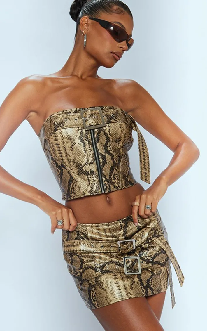 Bring a little drama to your weekend look with this brown snakeskin faux leather buckle detail bandeau corset. Its brown snakeskin faux leather material is sure to catch everyone’s eye and its buckle detail adds that extra edge to any look. This corset is a must-have addition to your weekend wardrobe and you won’t want to miss out on it. Style effortlessly with the matching micro mini skirt, knee-high heeled boots and silver hoop earrings for a look that will turn heads.