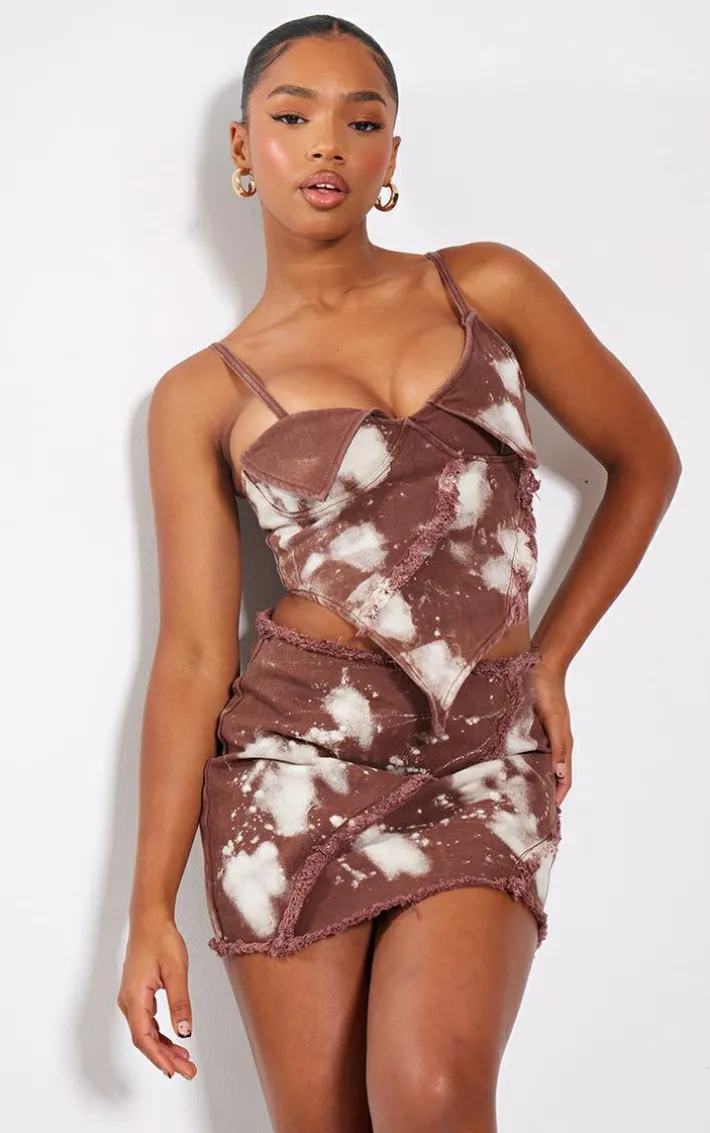 Take your weekend look to a whole new level with this brown splatter fray asymmetric hem denim crop top. Brought to you in a brown hue denim material with a splatter design, a frayed asymmetric hem and a cropped fit, how can you resist? We are loving this crop top styled with the matching mini skirt, clear strap heels and gold hoops for a look that is sure to have heads turning all night long.