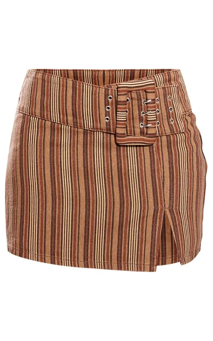 This brown stripe belted denim mini skirt is at the top of our hitlist this season. With a brown denim material, a stripe design, and belted detail, how could you say no? Be prepared to steal all the stares and earn that best-dressed status with this mini skirt. We’re loving it teamed with the matching corset top, knee-high heeled boots and a clutch bag for that weekend-worthy finish.