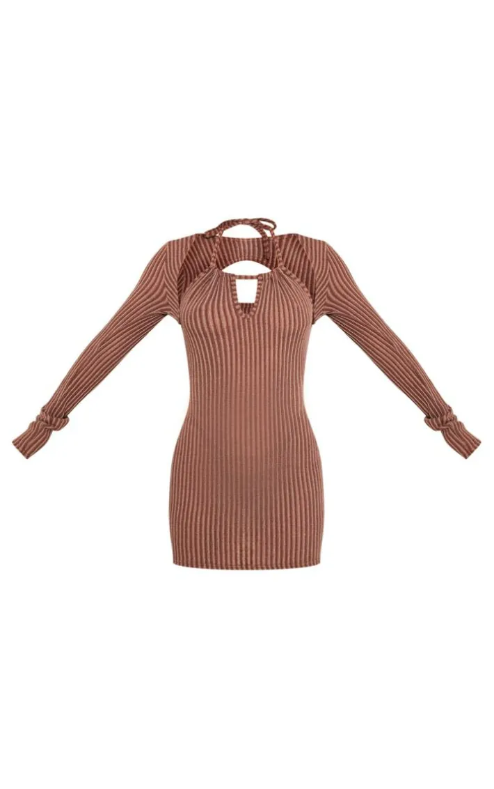 Your weekend wardorbe dilemmas have been solved with this brown textured cut out halter neck mini dress. Brought to you in a brown hue textured material with a halter neck design, cut out detailing and long sleeves, you really can’t go wrong. Style this mini dress with your highest heels and statement gold accessories for a look that will make heads turn for all the right reasons.