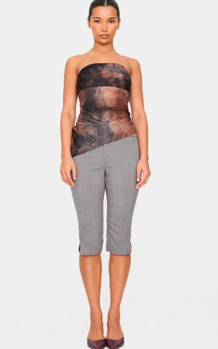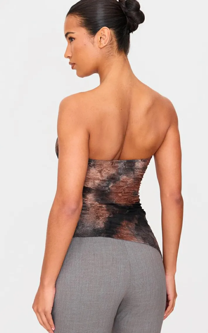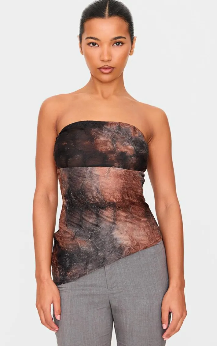Make weekend styling look effortless with this brown textured mesh asymmetric hem bandeau. Brought to you in a brown textured mesh material with an asymmetric hemline and a bandeau neckline, how can you resist? Style this brown bandeau with capris, heeled and simple gold accessories for a look that won’t go unnoticed.