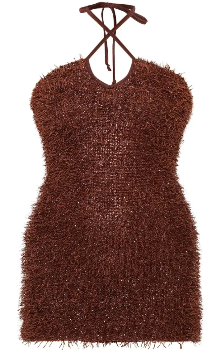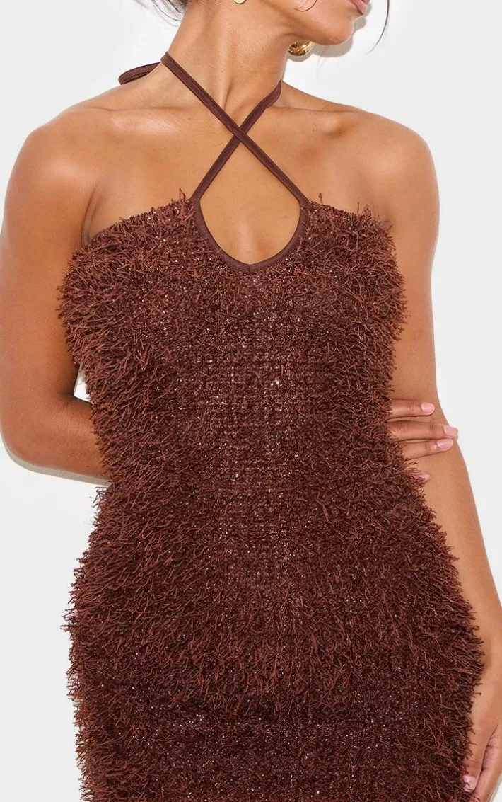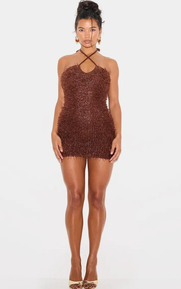 Have eyes on you for all the right reasons in this brown textured sequin cross tie halter mini dress. Brought to you in a brown textured material with a cross tie halterneck design, sequin detailing and a mini length, how can you resist? Style this mini dress with heels and gold accessories for a look that is perfect for your weekend plans.