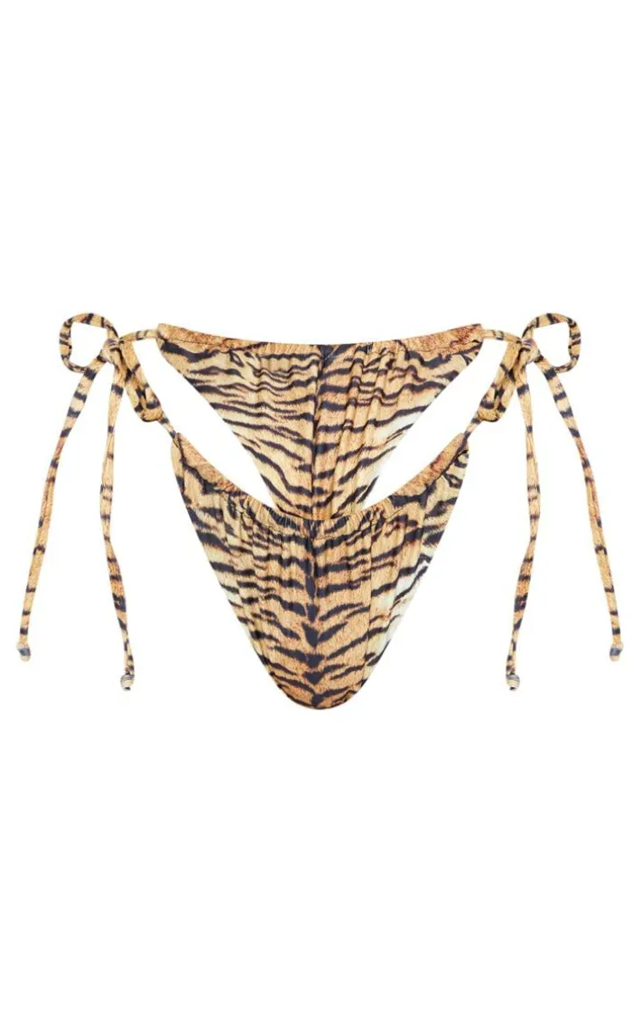 These bikini bottoms are sure to add a fierce touch to your poolside look. Featuring a brown tiger material with adjustable tie sides and a flattering fit, team them with the matching bikini top for a look we’re loving.