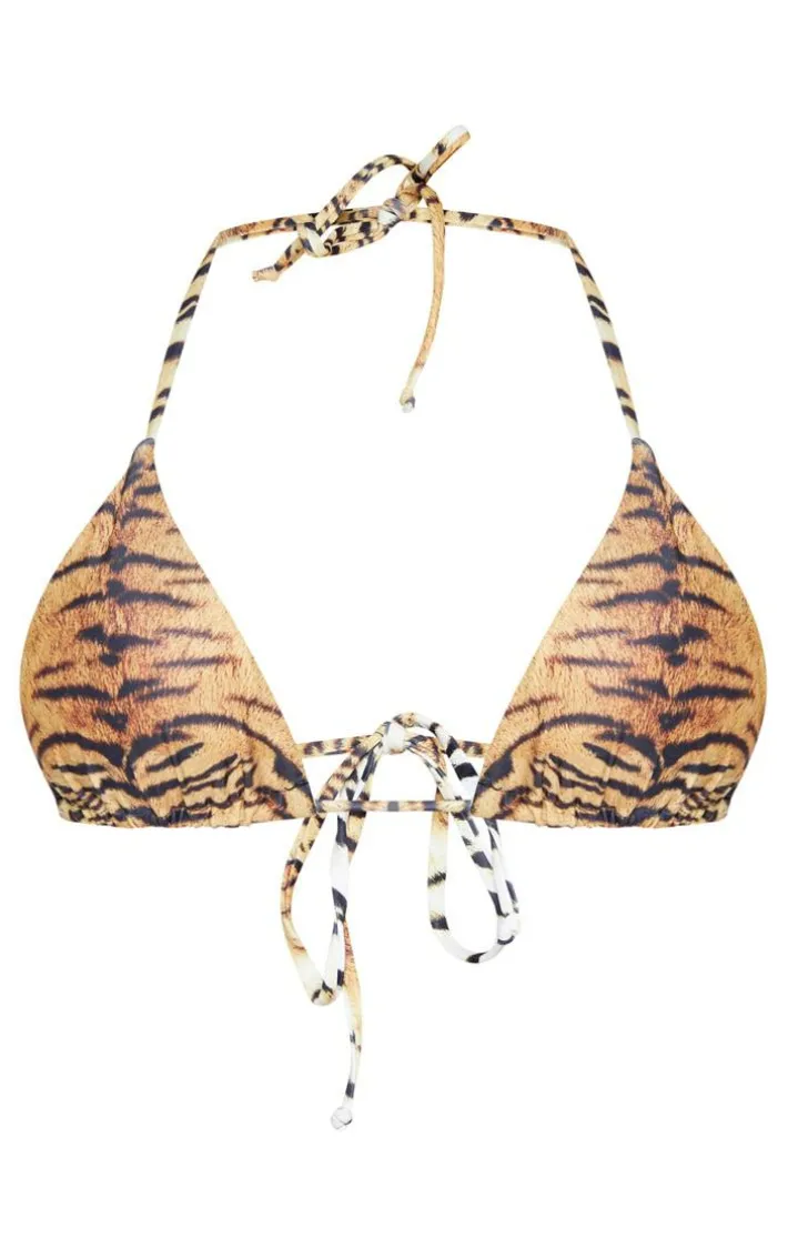 We’re loving this triangle bikini top right now. Featuring a brown tiger material with tie straps and triangle padded cups team it with the matching bikini bottoms for a look we’re obsessing over.