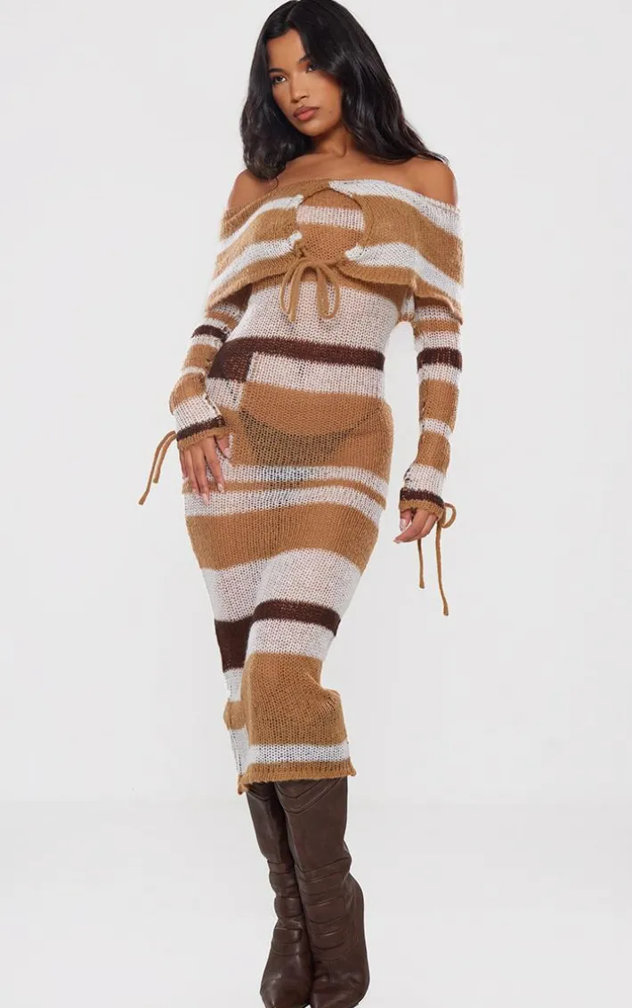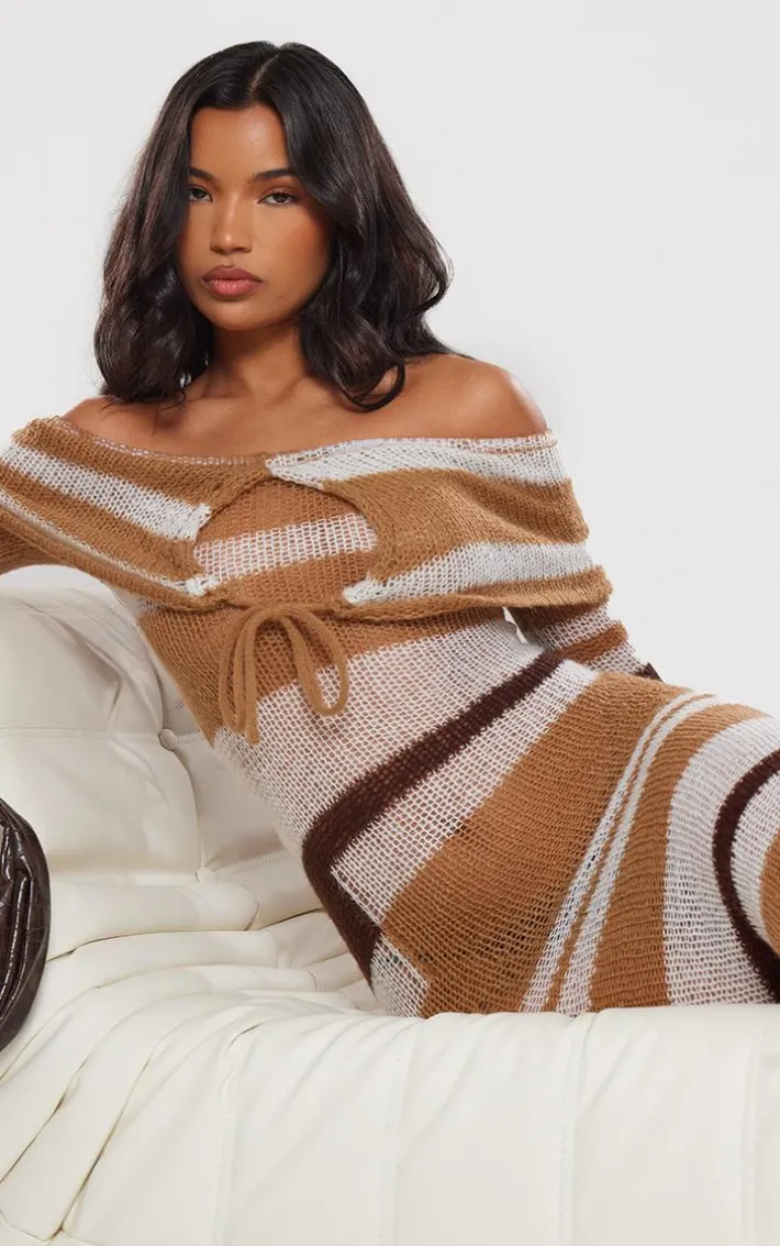 Inject all the luxe vibes into your weekend wardrobe with this brown tonal soft knit foldover tie detail bardot maxi dress. Brought to you in a brown tonal soft knit material with a foldover design and tie detail, what’s not to love? This maxi dress hugs your figure in all the right places and shows off your sultry side. Team with knee-high boots and gold accessories for a look that will be unforgettable.
