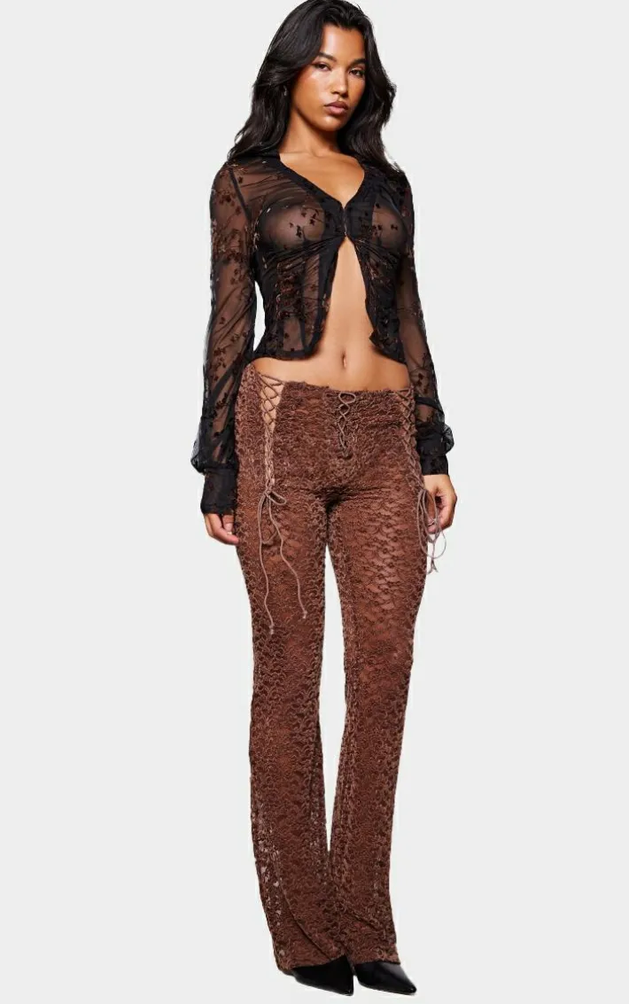 We can’t get enough of these brown velvet lace flared pants for the ultimate weekend-worthy look. Brought to you in a dreamy brown shade, with a luxe velvet lace material and flared design, you’ll be reaching for these every evening and beyond. Style with a lace long sleeve top, your fave heels and silver accessories for a ‘fit that won’t disappoint.