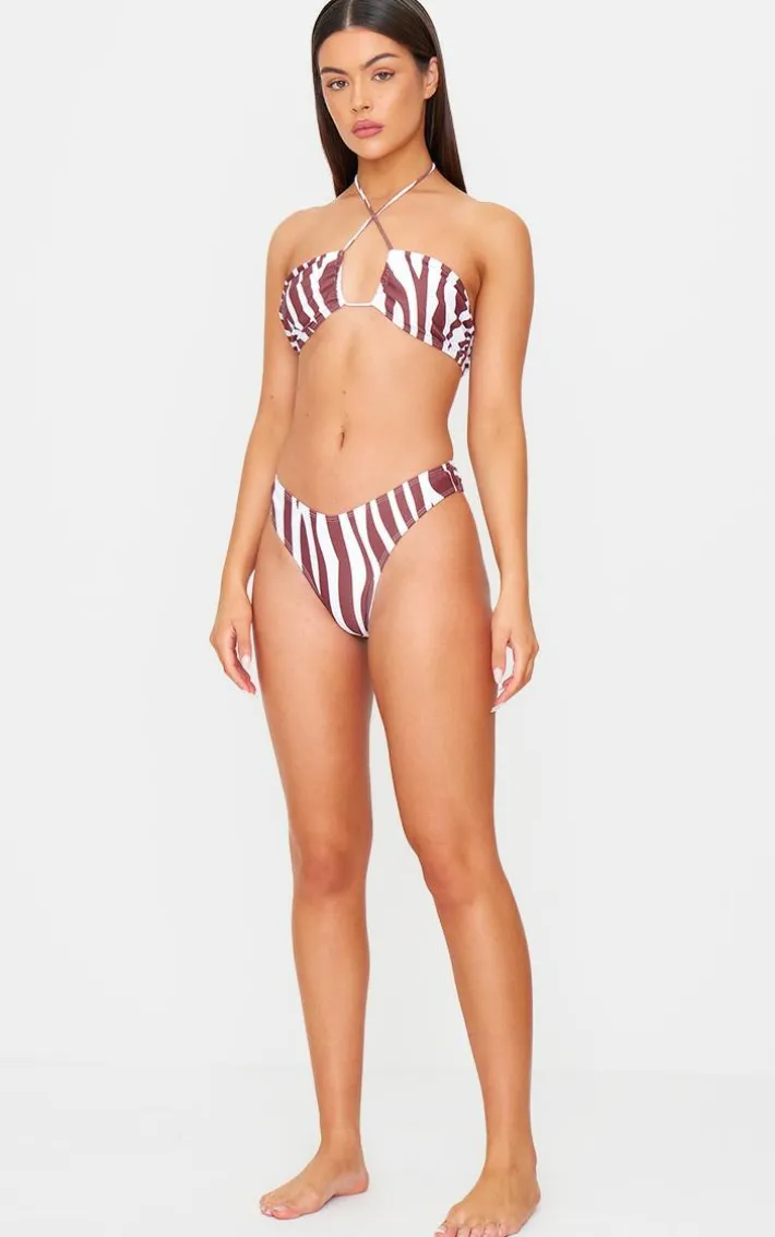 Add some animal prints to your swimwear collection with this brown zebra print halter tie bikini top. Brought to you in a brown hue material with a zebra print design and a halter tie fastening, what more could you need? Pair this bikini top with the matching bottoms and simple accessories for a look that is sure to show off your tan.