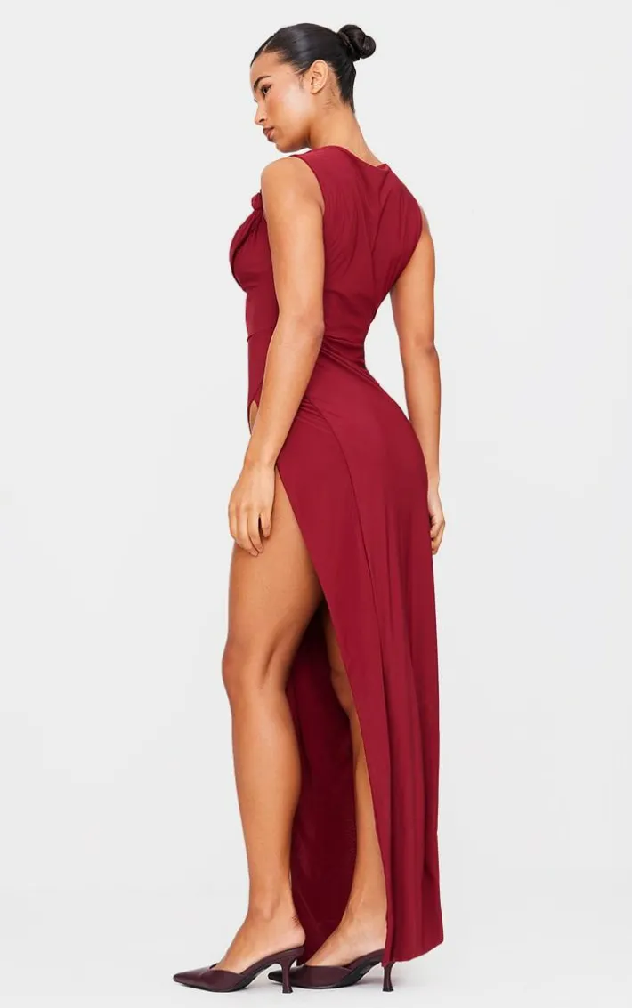 Your new season wardrobe is calling out for this burgundy double layer draped knotted split maxi dress. Brought to you in a burgundy hue fabric, with a double layer draped fabric and a knotted feature, it’s here to make a statement. Turn heads by pairing with high heels and your must-have accessories.