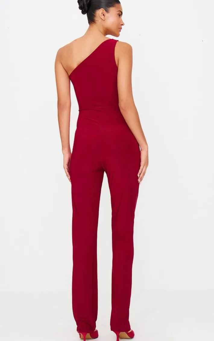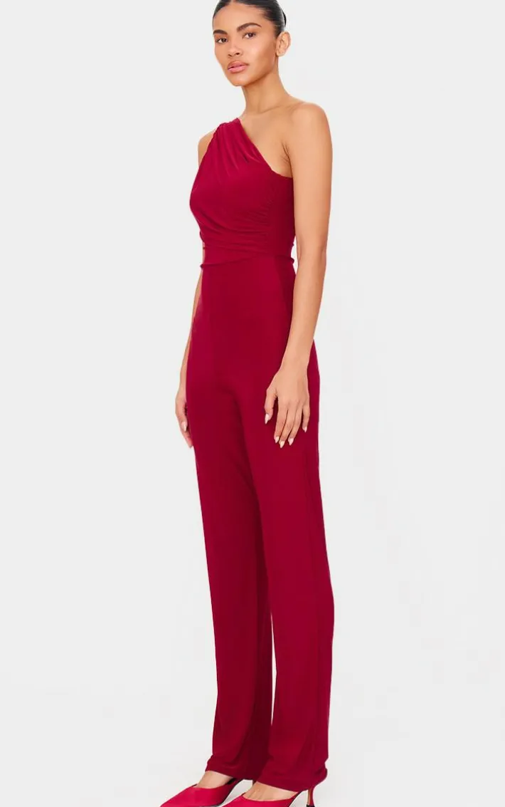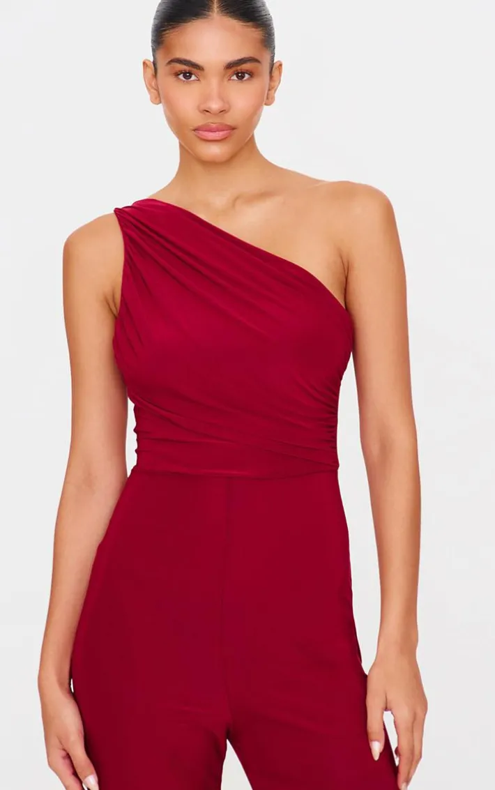 Make a statement with this burgundy double layer slinky asymmetric ruched detail jumpsuit. Brought to you in a burgundy double layer slinky material with an asymmetric design and a ruched detail, you are sure to turn heads in this jumpsuit. Pair with heels and your fave accessories for a look like no other.