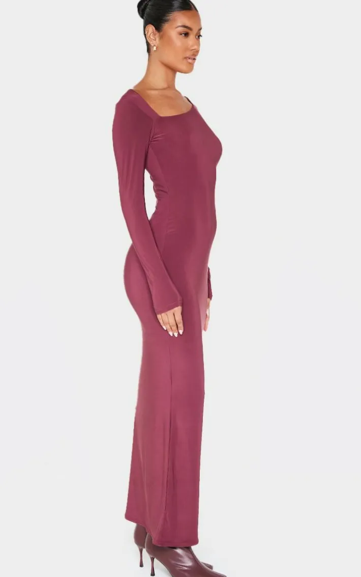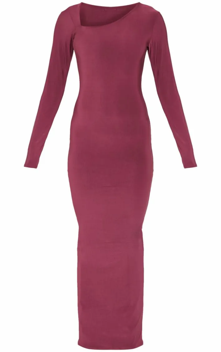 When the weekend calls so does this burgundy double slinky asymmetric neck line long sleeve maxi dress. Brought to you in a burgundy hue double slinky material with an asymmetric neckline and long sleeves, this maxi dress is all the new you need. We’re in love. Style with heeled boots and simple accessories to elevate the look.