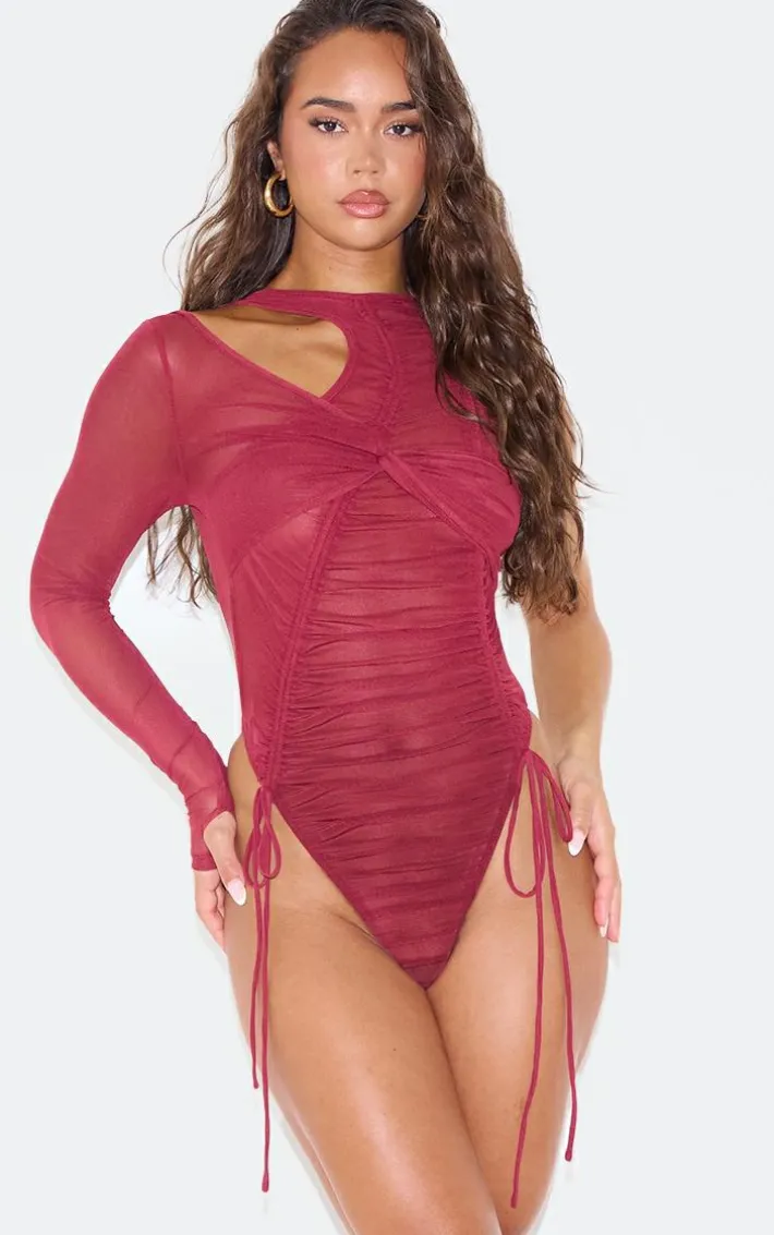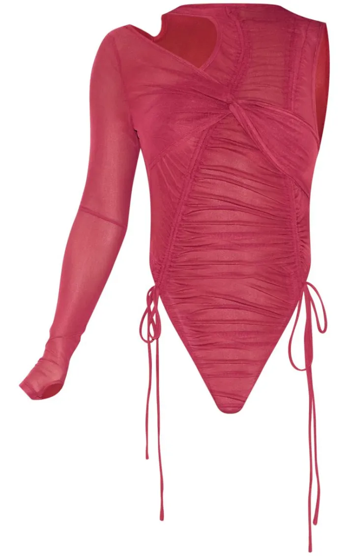 When your weekend look needs a little more drama, we’ve got you covered with this dark red extreme ruched seam detail one sleeve bodysuit. Made from a dark red material with an extreme ruched design, seam detailing and one sleeve, how can you resist? Pair this dark red bodysuit with the matching skirt, heels and gold accessories for a look that will steal all the stares.