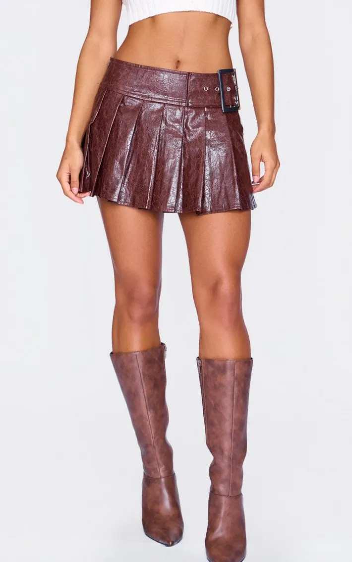 Stay on trend all season long in this burgundy faux leather belt pleated mini skirt. Brought to you in a burgundy hue faux leather material with a pleated design and belt detailing, you really can’t go wrong. Style this mini skirt with a taupe tee, clear heels and your fave accessories for a look we’re loving right now.