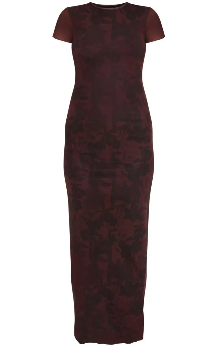 Amp up your outfit of the day with this dress. Featuring a burgundy mesh material with a floral print design and short sleeves. Pair with chunky boots and a faux leather jacket for a chic, off-duty vibe.