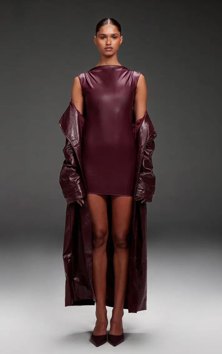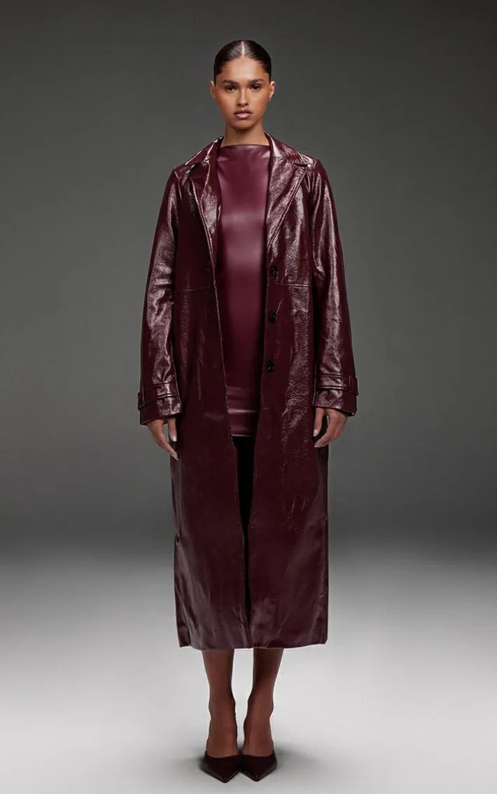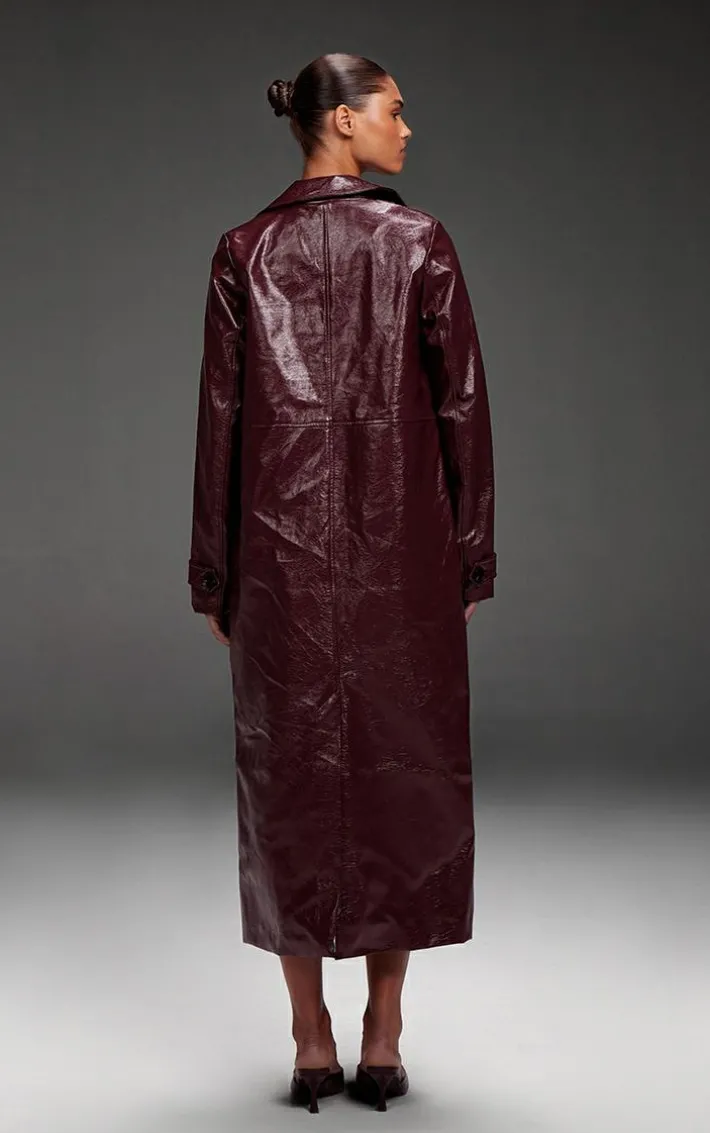 This burgundy high shine textured faux leather maxi coat is at the top of our new season hit list. Brought to you in a burgundy hue high shine textured faux leather material with a button through design and a maxi length, what more could you need? Layer this faux leather coat over a neutral mini skirt and loafers for a look that is sure to earn you some serious style points.