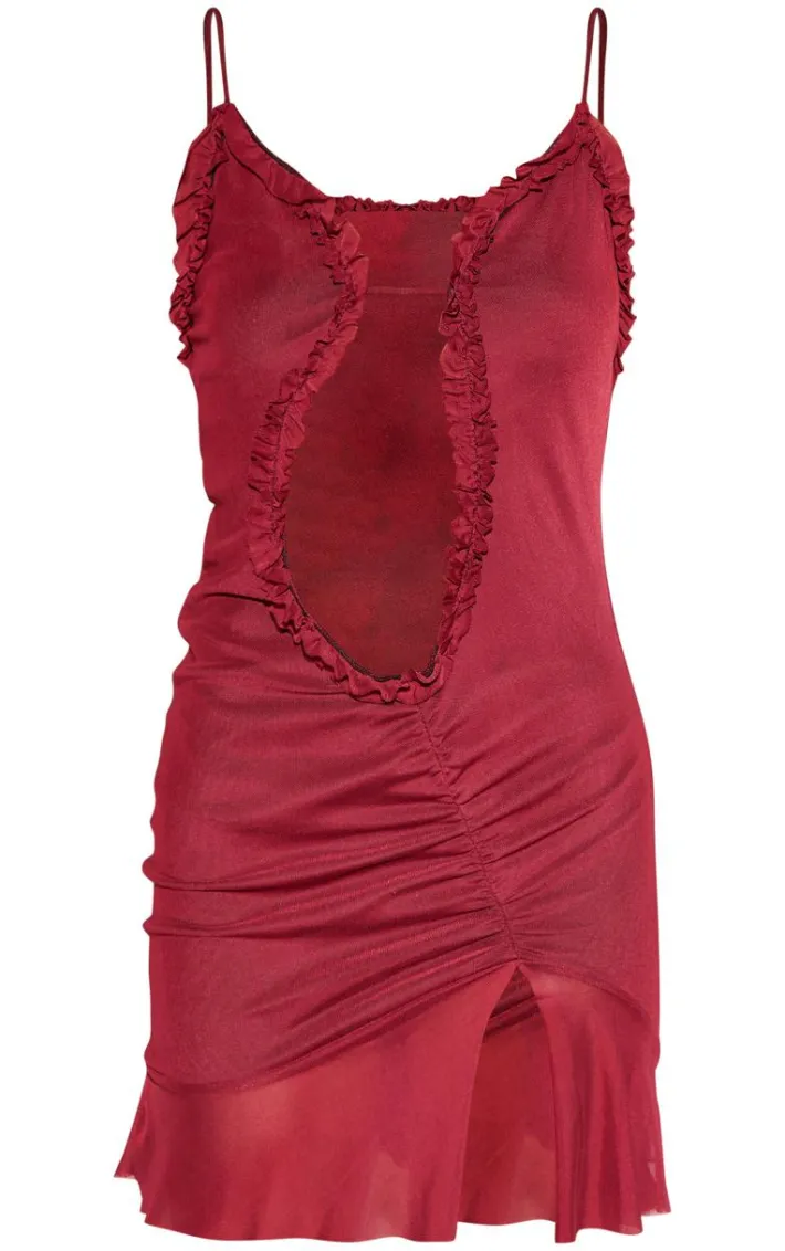 Make a statement this weekend with this dark red mesh cut out frill detail ruched bodycon dress. Brought to you in a dark red mesh material with a cut out design and frill detail, how can you resist? Team it with red heels, gold accessories and mini bag for a look everyone’s obsessing over.