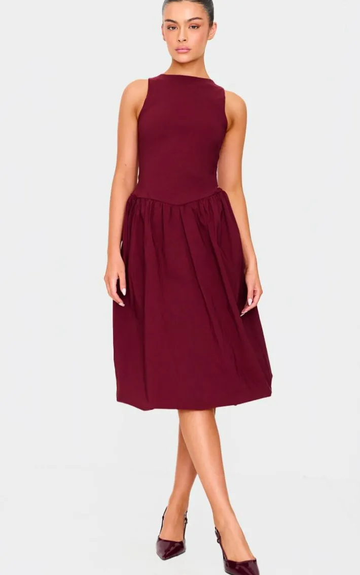 Say hello to your new season staple with this burgundy racer drop waist puffball midi dress. Brought to you in a burgundy hue material with a racer neckline, drop waist detail and puffball skirt, this midi dress is everything your new season wardrobe needs and more. Pair with burgundy heels and gold accessories to elevate the look.