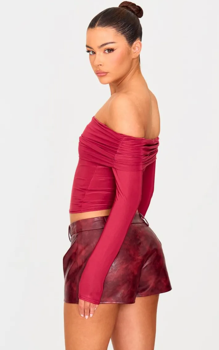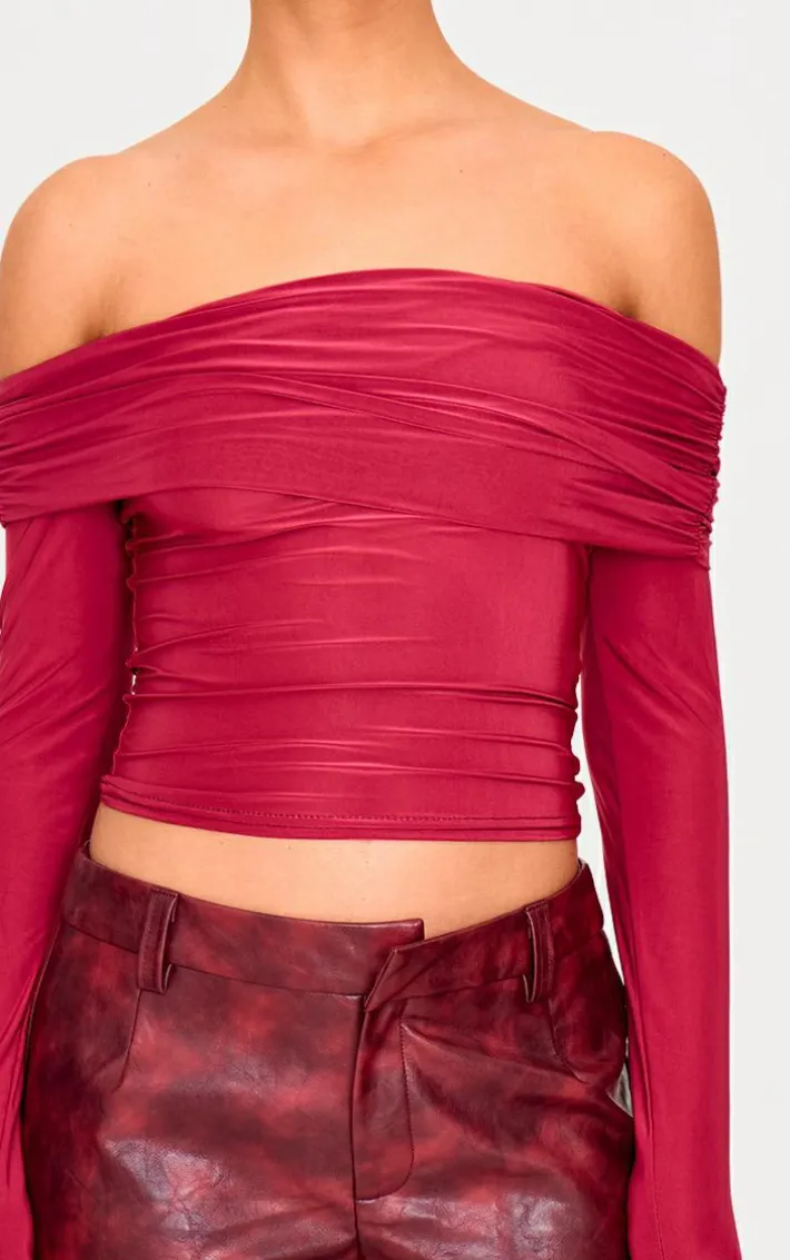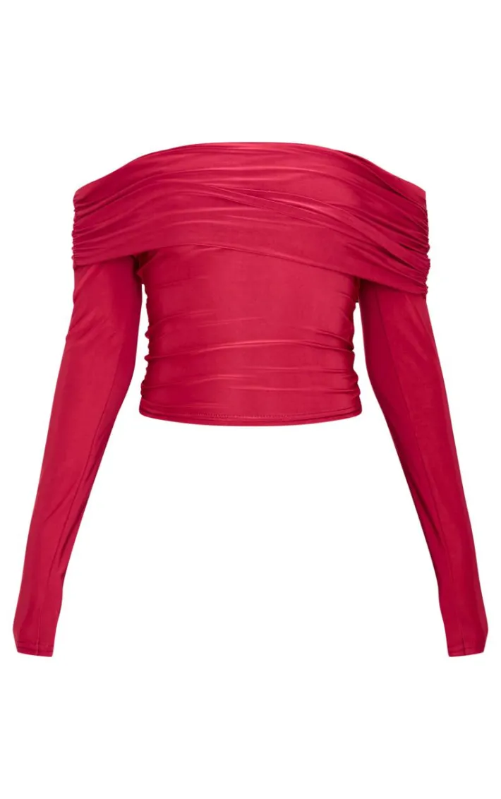 Look all kinds of chic in this burgundy slinky bardot long sleeve long top. Brought to you in a burgundy hue slinky material with a bardot neckline and long sleeves, this long top is everything your new season wardrobe needs. Team with a burgundy mini skirt, slip on heels and gold accessories for an on trend look everyone will be asking about.