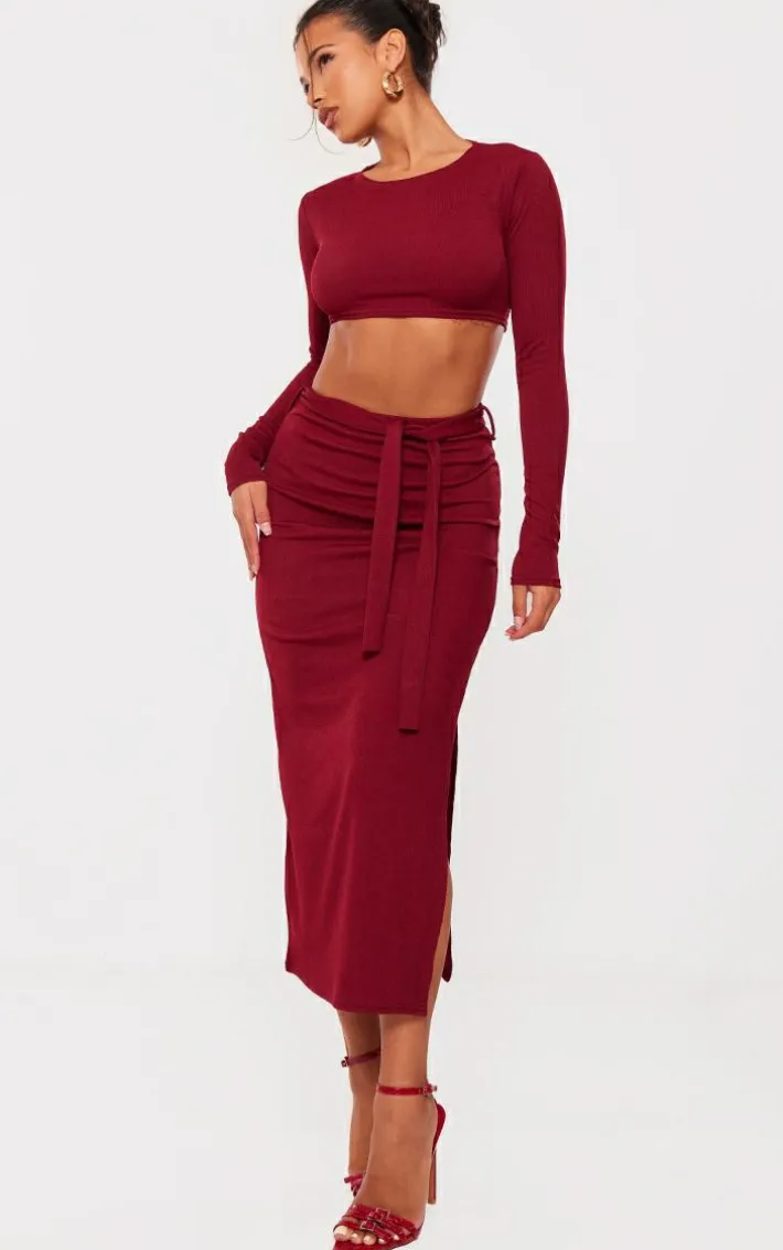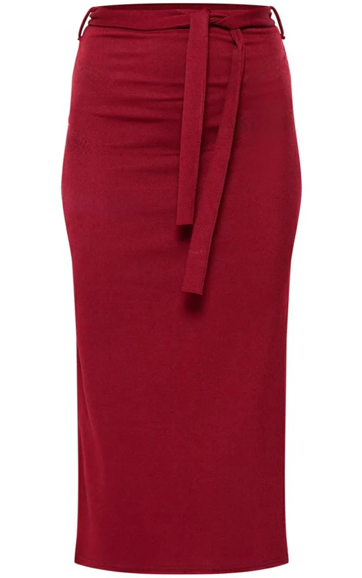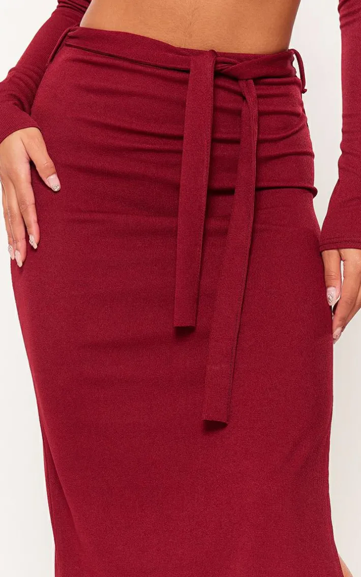 We are loving burgundy this season, that’s why this burgundy stretch rib tie waist midaxi skirt is perfect for you. Brought to you in a burgundy stretch material with a rib design, what’s not to love? Its tie waist and midaxi length are all you need to feel chic this season. Team with some court heels and your fave accessories for a fool proof finish.