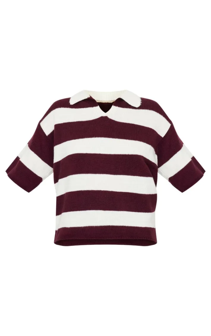 This burgundy stripe knit V neck oversized rugby top is a must have in your new season collection. Brought to you in a rich burgundy hue, with a stripe design, cosy knit material and oversized fit, reach for this to elevate any look. Style with a pair of wide leg jeans and court heels for an instantly chic finish.