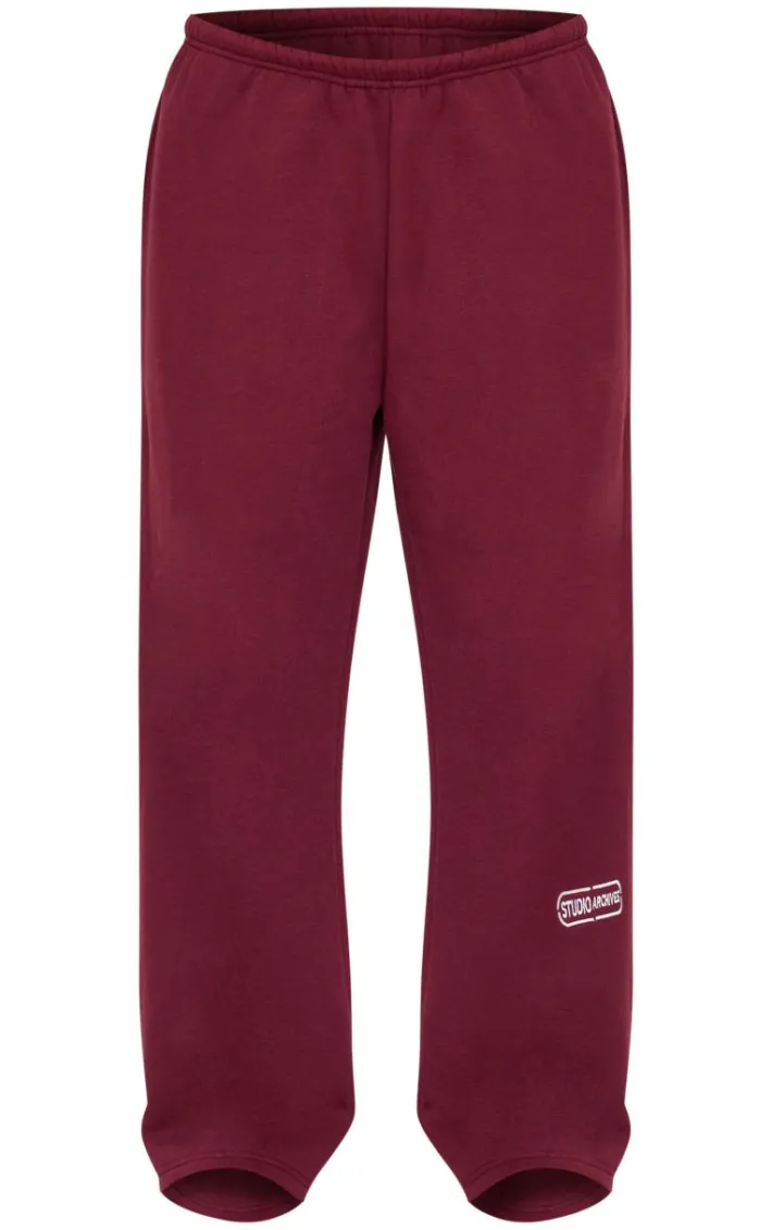 Take your off duty look to new heights with these burgundy studio archives embroidered thin waistband drop crotch sweatpants. Brought to you in a burgundy hue sweat material with a studio archives embroidered design, thin waistband and drop crotch detail, these sweatpants are a must have. Style with the matching Sweatshirt, fresh kicks and simple accessories for a look like no other.